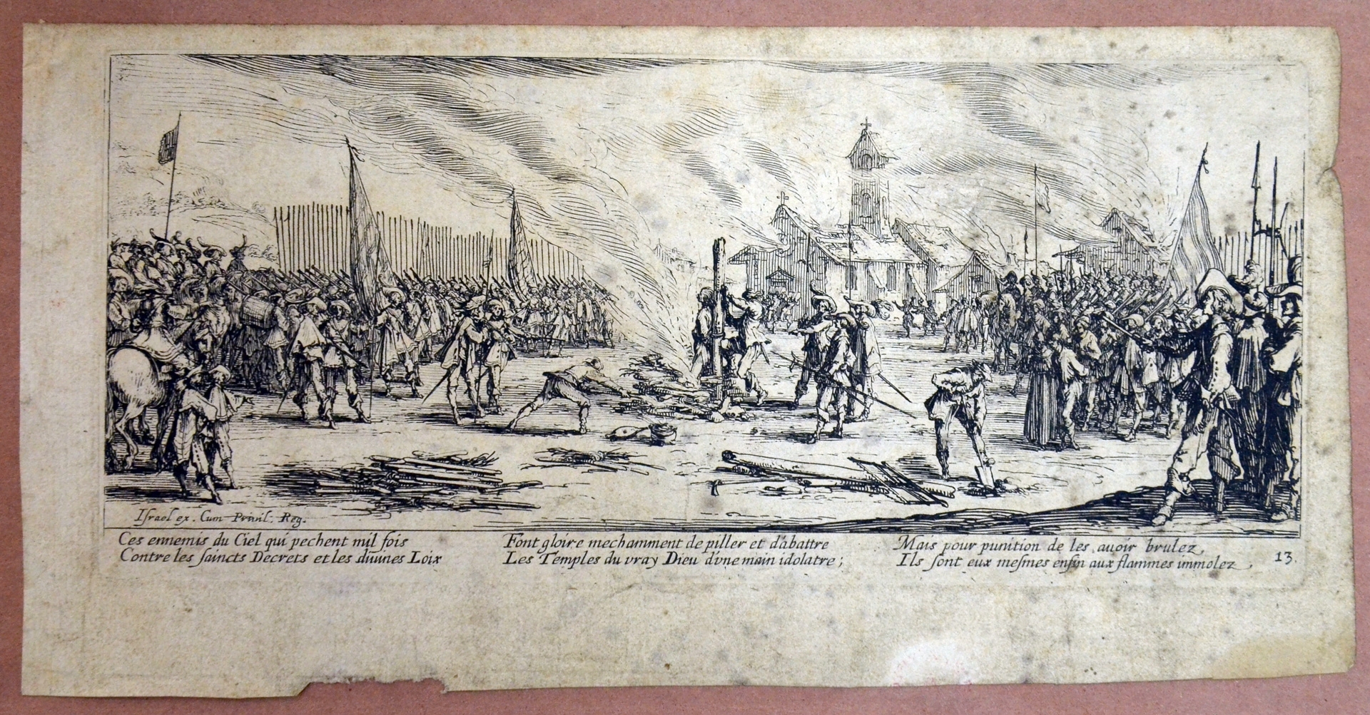 În centrul compoziţiei - un om legat cu mîinile la spate de un stîlp, la picoarele lui - un rug. În jur e o aglomeraţie de personaje, în plan secund sunt construcţii arhitectonice în flăcări.