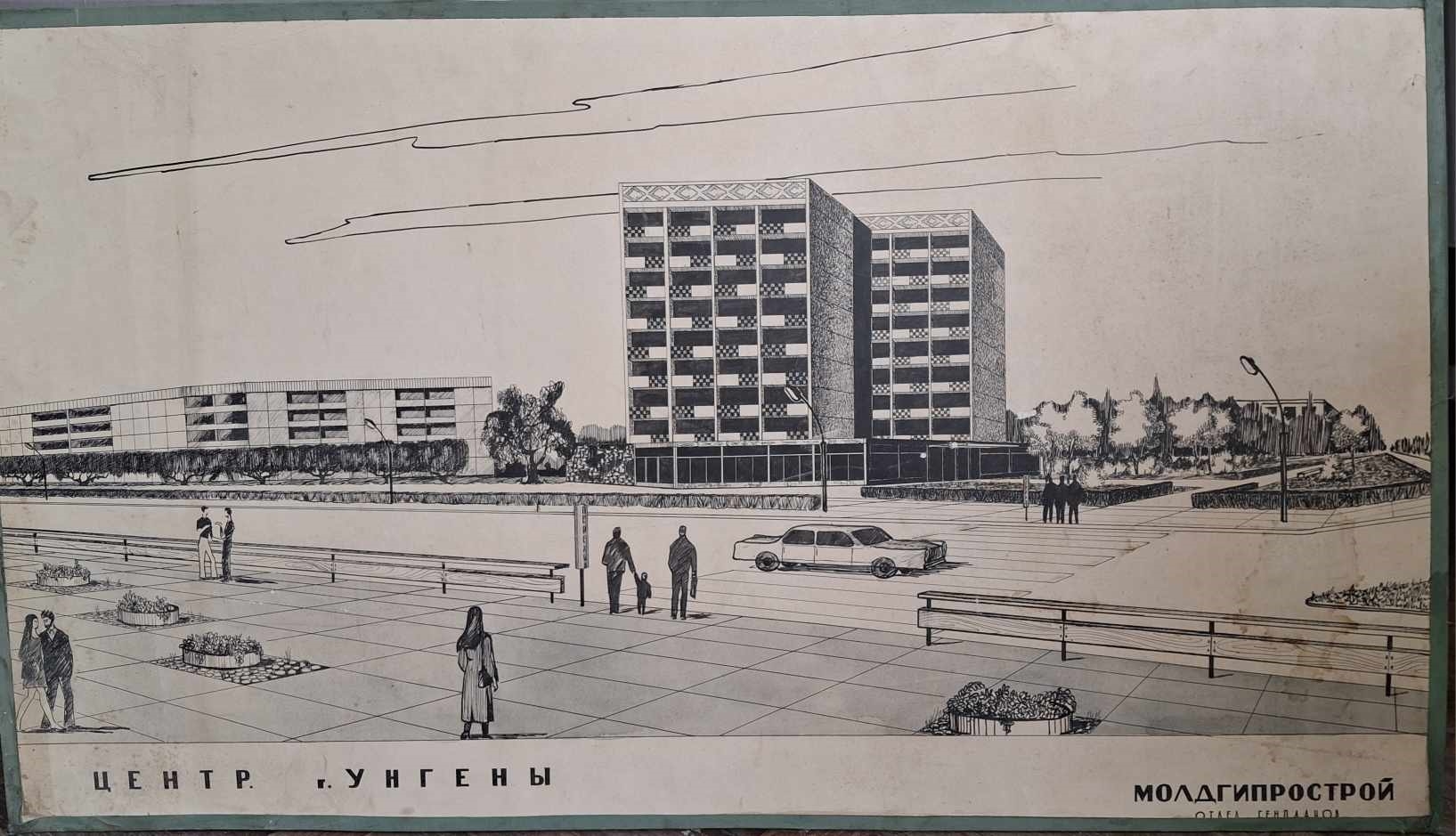 Grafică ,, Centrul orașului Ungheni’’ realizată manual cu tuș negru pe carton. Are marginile învelite cu material textile verde. În partea de jos scrie ,,центр г. Унгены și denumirea organizație de stat care l-a realizat ,,Молдгипрострои’’. În lucrare se observă, pe mijloc, două clădiri înalte și una mai mica pe partea stângă. În centru este o mașină. Pe partea pietonală sunt plasați 12 oameni aleatoriu.