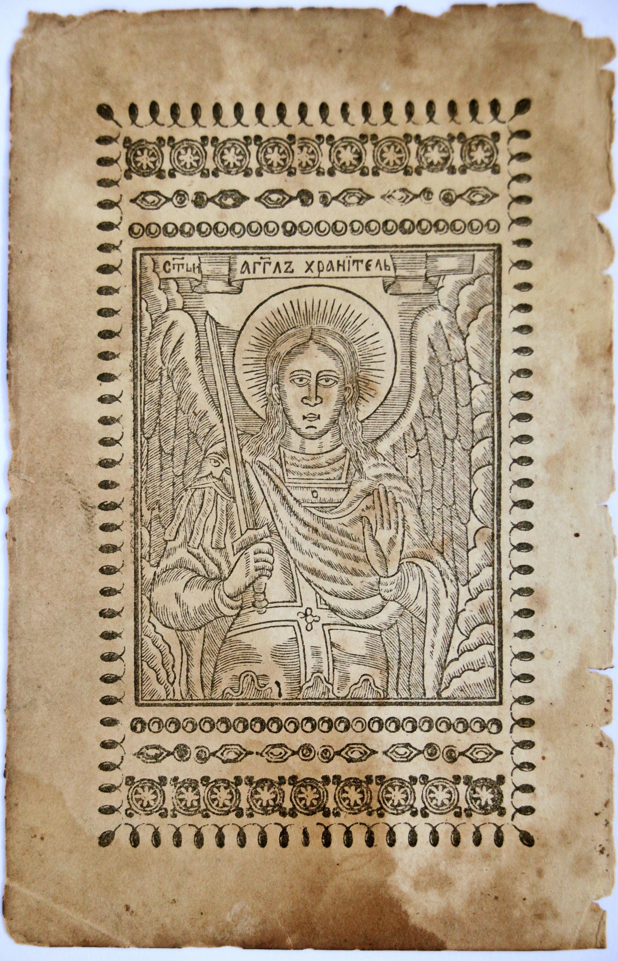 Subiect biblic - un înger redat până la brâu, în armură, ține o sabie într-o mână ridicată. Fundal - nori, sus - fâșie cu ornamente geometrice.
