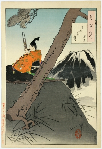 Pe un promontoriu – un bărbat (Yosimitsu) rezemat de tulpina unui copac, cântând la un instrument muzical din tuburi de bambus (sho). Poartă un kimono portocaliu, pe cap cu o bonetă neagră.