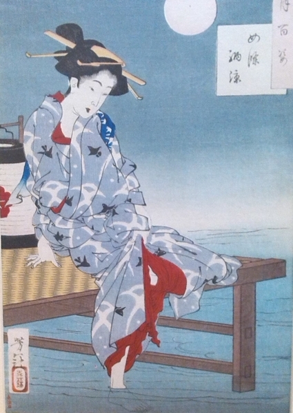 O femeie tânără șezând pe o bancă, cu capul lăsat ușor pe umărul stâng, cu un picior în apa râului. Poartă un kimono în nuanțe de gri și alb – deasupra și unul de culoare bordo – dedesubt. Cu părul prins cu ace de păr.