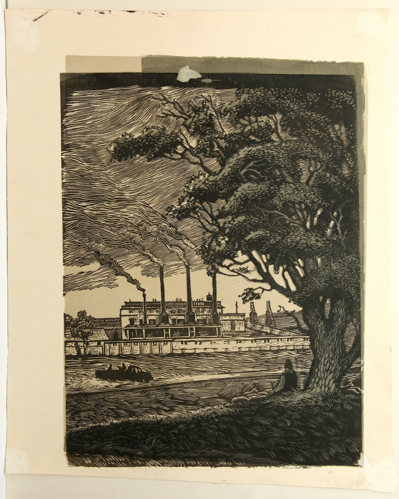 Peisaj industrial reprezentînd clădirea unei uzini cu 4 coșuri de fum și un gard de jur împrejur. În prim plan, stînga - un copac mare și rotat, cu tiulpină groasă sub care stă așezat un bărbat, alături pasc cîteva oi. Stînga, planul doi - un camion pe un