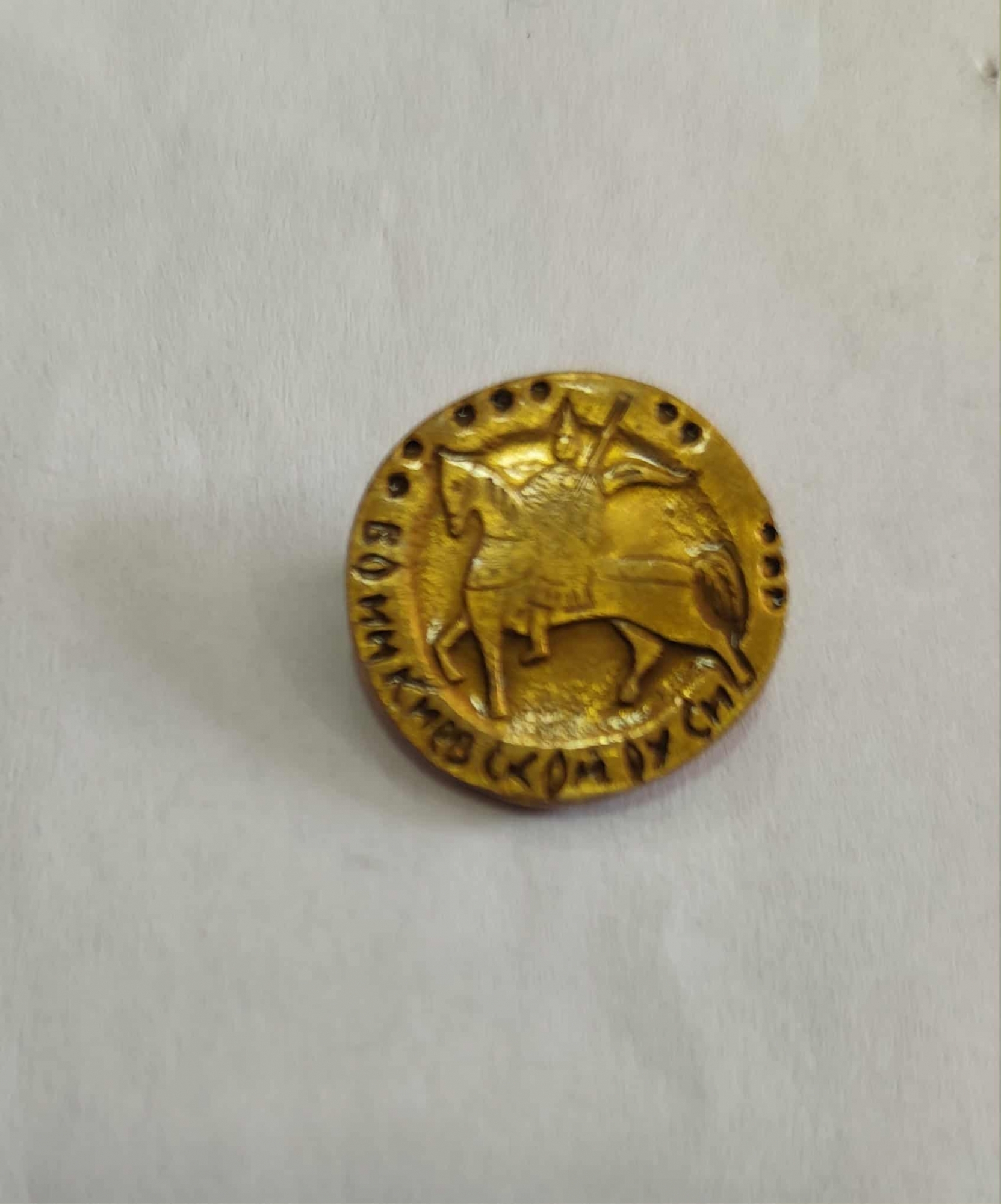 Călărețul poartă o mantie care flutură în spate și probabil o cască. Poziția sa este din profil, orientată spre stânga. Calul este de asemenea reprezentat din profil, orientat spre stânga. fiind într-o postură dinamică, de mers sau de galop. Pe marginea insignei, în partea de jos și stânga-jos, se observă o inscripție circulară, scrisă cu caractere care par a fi din alfabetul chirilic, fiind greu de descifrat. Caracterele și stilul imaginii sugerează o temă istorică sau religioasă, posibil legată de iconografia Sfântului Gheorghe (un călăreț pe cal). Pe marginea superioară a cercului, deasupra capului călărețului, există un rând de mici perforații regulate, care înconjoară parțial sau total imaginea.