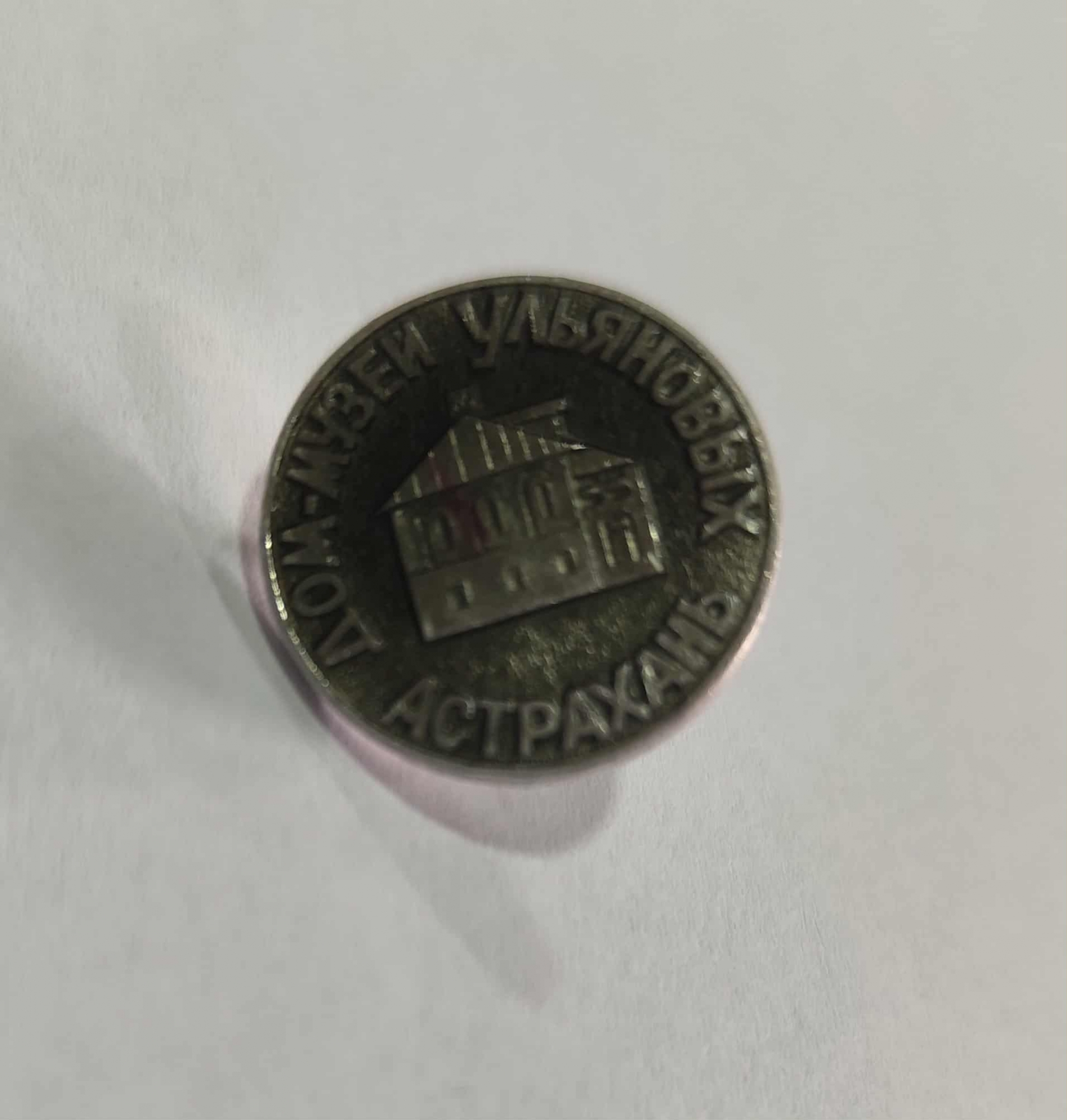 Insigna are o formă circulară, cu un finisaj de culoare metal închis, mat, care îi conferă un aspect sobru, patinat. De-a lungul marginii superioare se află inscripția în limba rusă, în caractere chirilice majuscule: ДОМ-МУЗЕЙ УЛЬЯНОВЫХ (Casa-Muzeu a Familiei Ulianov). De-a lungul marginii inferioare se află numele orașului: АСТРАХАНЬ (Astrahan). Insigna comemorează Casa-Muzeu a Familiei Ulianov din orașul Astrahan, Rusia (fosta URSS). În centrul insignei este reprezentat, în stil stilizat, bidimensional (ca o pictogramă), un edificiu cu două etaje și un acoperiș distinct. Clădirea este redată într-o manieră simplă, cu linii clare, arătând ferestrele și forma generală a fațadei, reprezentând clădirea istorică a muzeului. Imaginea clădirii este ușor în relief față de fundalul întunecat al insignei. Familia Ulianov este renumită deoarece Ipatie Nikolaevici Ulianov, tatăl lui Vladimir Ilici Lenin, s-a născut și a locuit în acea clădire pentru o perioadă. Astfel de insigne erau populare în URSS ca amintiri ale obiectivelor istorice și culturale.