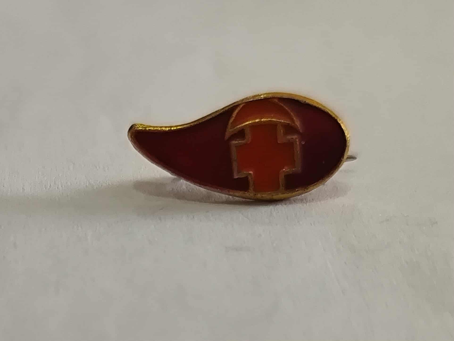 În centrul formei de picătură se află un simbol compozit: o cruce simplă, echilaterală, înscrisă într-un arc. Crucea este de culoare roșu-portocaliu și este înconjurată de o bandă de culoare portocaliu-roșiatic deschis, care o separă de roșul închis al fundalului.Forma din jurul crucii are o nuanță de portocaliu-roșiatic care se deschide spre partea superioară și este mai închisă spre partea inferioară. Insigna indică apartenența la o organizație legată de asistență medicală, cum ar fi Crucea Roșie, dar într-o variantă stilizată.