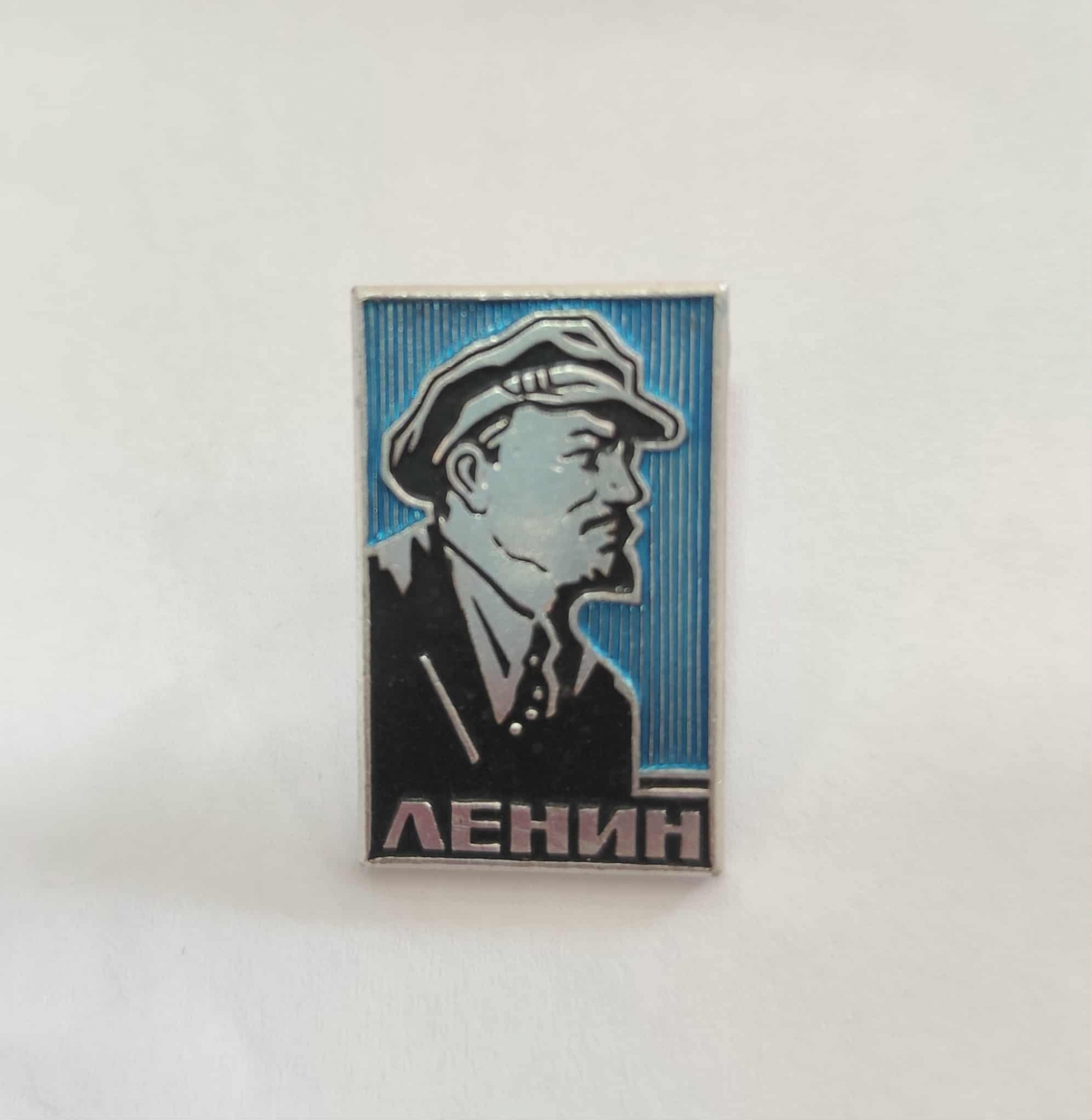 Insigna este de formă dreptunghiulară verticală, cu colțuri ușor rotunjite. Imaginea îl prezintă pe Vladimir Ilici Lenin (1870–1924), liderul Revoluției Bolșevice și fondatorul Uniunii Sovietice, fiind prezentat în profil, orientat spre dreapta. Poartă un costum (sau palton) închis la culoare (negru/albastru închis) și o șapcă tip caschetă (uneori numită și "șapca lui Lenin"). Chipul și mâinile par a fi redate într-o culoare deschisă, palidă sau argintie/gri, contrastând puternic cu fundalul. Fundalul din spatele portretului este de culoare albastru deschis (azur), cu un efect de linii verticale paralele, care dau textură și mișcare fundalului. Insigna are un contur metalic subțire, de culoare argintie, care înconjoară portretul și fundalul. Sub portret, pe o bandă orizontală separată, de culoare închisă este scris în chirilică: ЛЕНИН (LENIN)