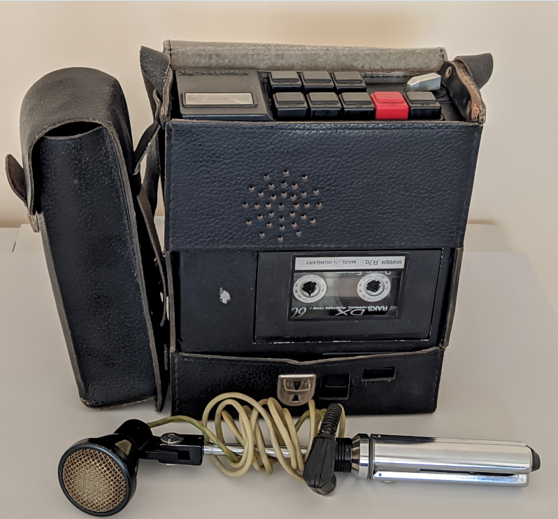 Este portabil pe umăr cu microfon. Are forma dreptunghiulară cu suprafața metalică de culoarea neagră. În partea de sus sunt situate 8 butoane (7 negre și 1 roșu), un mâner din aluminiu și un ecran din plastic cu undici (de la -10, până la-1). Pe latura din față este un dispozitiv pentru caseta de înregistrare cu marca:R 7a, MADE ÎN HUNGARY. Latura de jos are două întrări pentru cablul de (9V) și numărul: Nr. 867292. Alături un depozit pentru 6 baterii de 1,5 Volți. Microfonul are posibilitatea de unire cu reportofonul prin cablu. Dispozitivul se lungeste și poate să stea pe pe masă pe trei picoare. Reportofonul are în complet o husă din piele naturala de culoarea neagră.