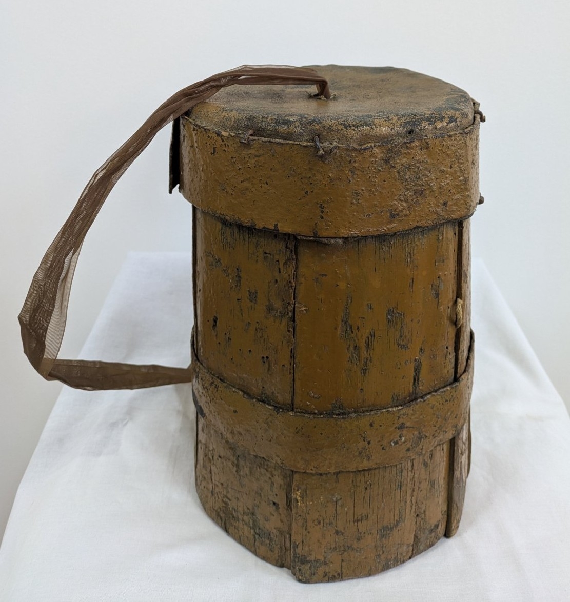 Vas de lemn, de forma unei găleți, din doage fixate cu două inele metalice. Partea de jos, mai îngustă este acoperită cu piele de animal, bine întinsă și fixată cu un cerc metalic. Prin mijlocul pielei este trecută o fundă de nailon. Istorie: Buhaiul este un instrument muzical popular folosit de colindători, în obiceiurile sărbătorilor de iarnă, în special la urat și Plugușor. De obicei, prin mijlocul membranei de piele este trecut un smoc de păr de cal, care atârnă în interiorul vasului și este tras (după modelul mulsului) cu degetele umezite (cu borș sau apă). Sunetul produs este grav, ciudat și nemuzical, imită mugetul animalelor din categoria bovinelor, animale care fac parte din peisajul obișnuit al spațiului rural. Piesa a fost donată muzeului în anul 2006 de către Dumitru Rittingher, colectată din satul Colibași.