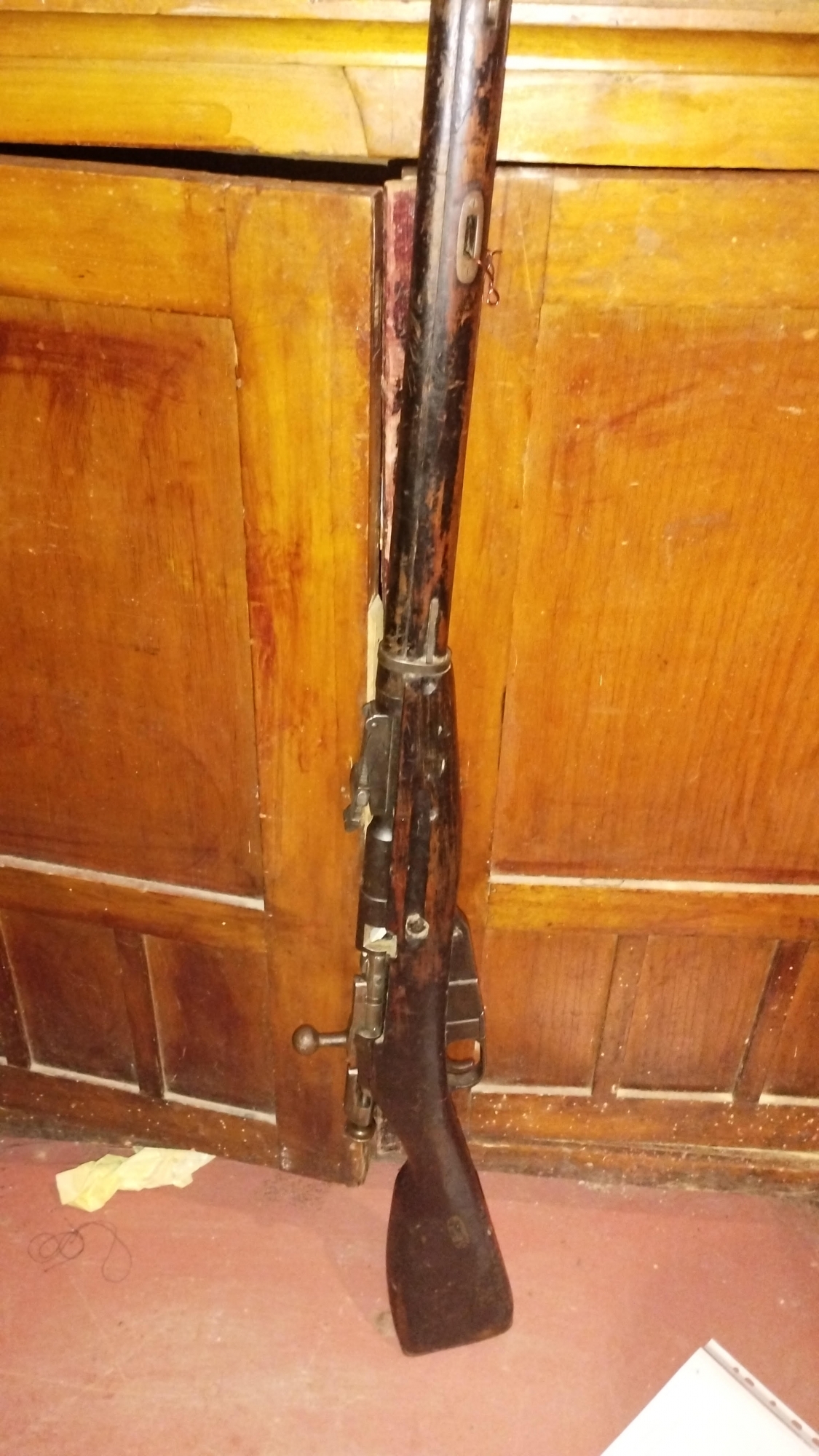 Mosin-Nagant (cunoscută și sub denumirea de "Mosinka" sau "Trei linii"). Exemplarul din imagine pare a fi o variantă timpurie sau un model M1891, având în vedere lungimea țevii și configurația patului de lemn.