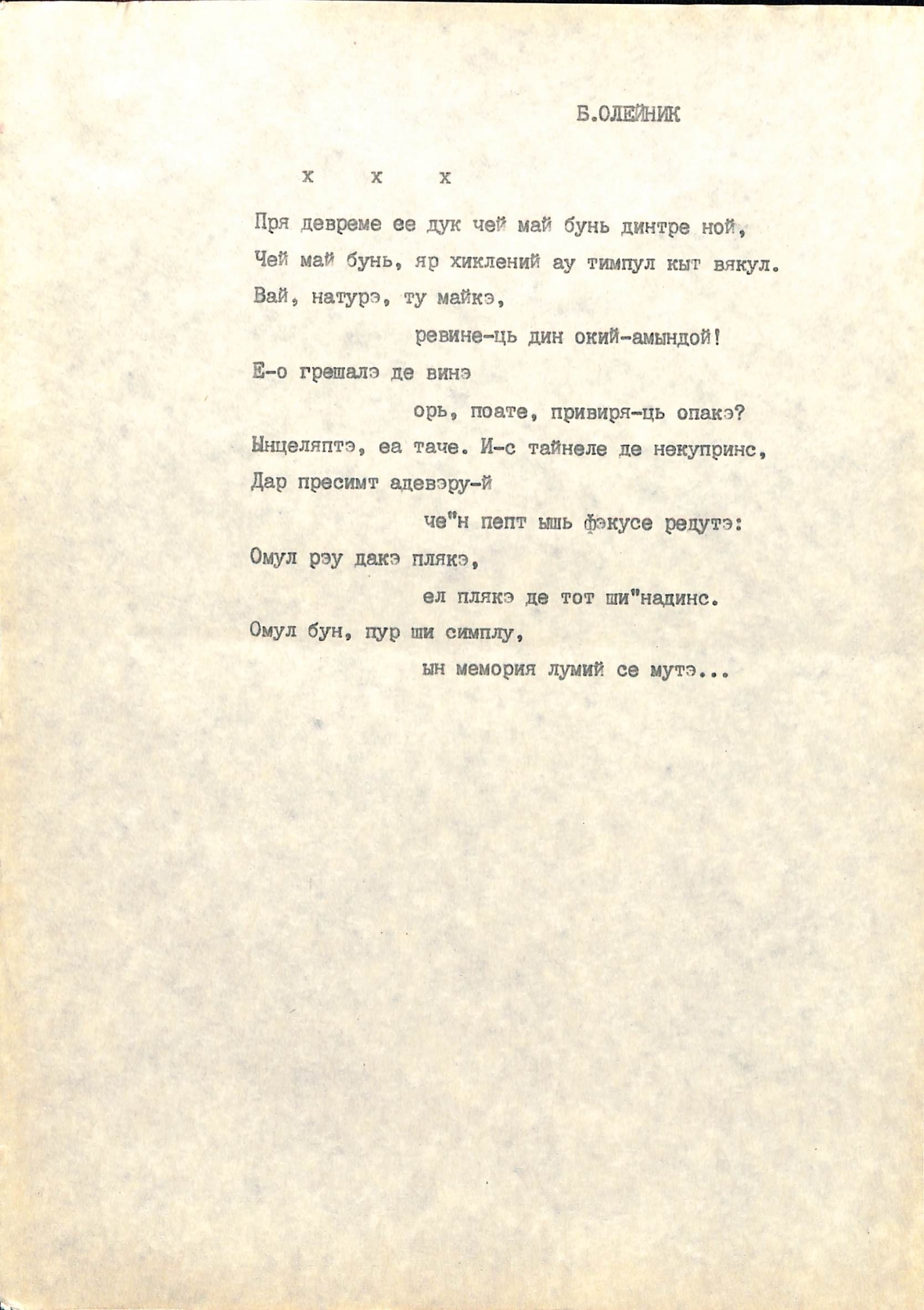 Boțu, Pavel. Manuscris dactilografiat. Poezia fără titlu cu început de vers: „Prea devreme se duc cei buni dintre noi...” de scriitorul Boris OLEINIK este tradusă de scriitorul Pavel BOȚU. Poezia este dactilografiată în limba română cu caractere chirilice. Pe pagina manuscrisului, sus colț dreapta este dactilografiat: „B. OLEINIK”. Fără datare.