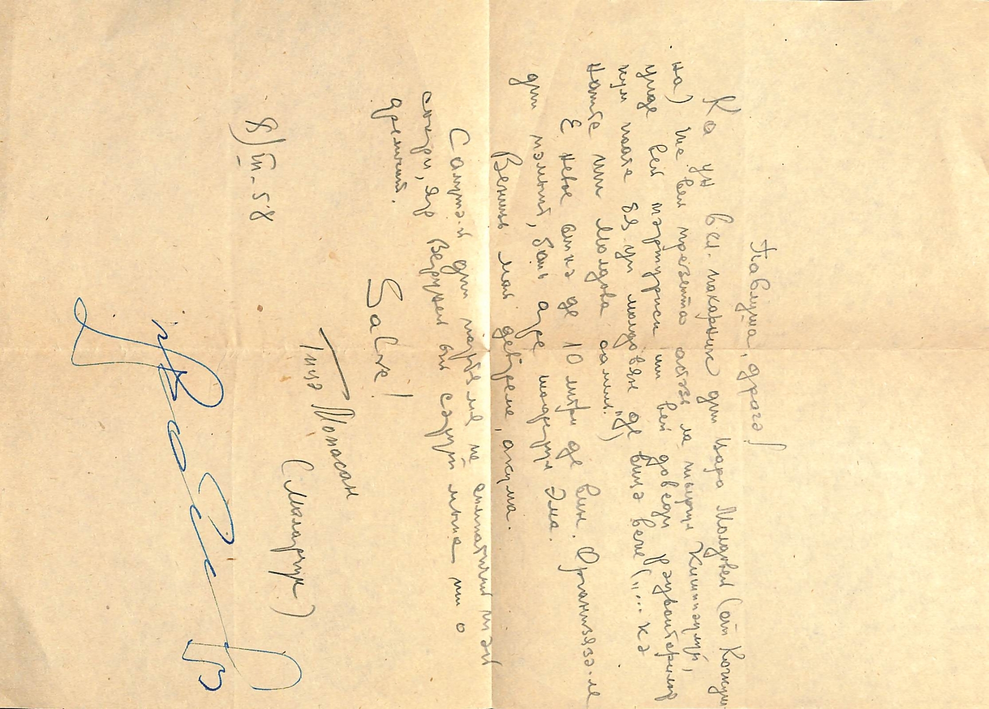 Boțu, Pavel. Manuscris olograf. Scrisoare fără plic adresată scriitorului Boțu Pavel de la scriitorul Malarciuc Gheorghe. Text scris olograf în limba română cu caractere chirilice cu creion simplu în culoare neagră. Este semnătura olograf a lui Gheorghe Malarciuc, scrisă cu stilou în culoare albastru-violet. Scrisoarea este datată: „8. III. 58”. 1 p.