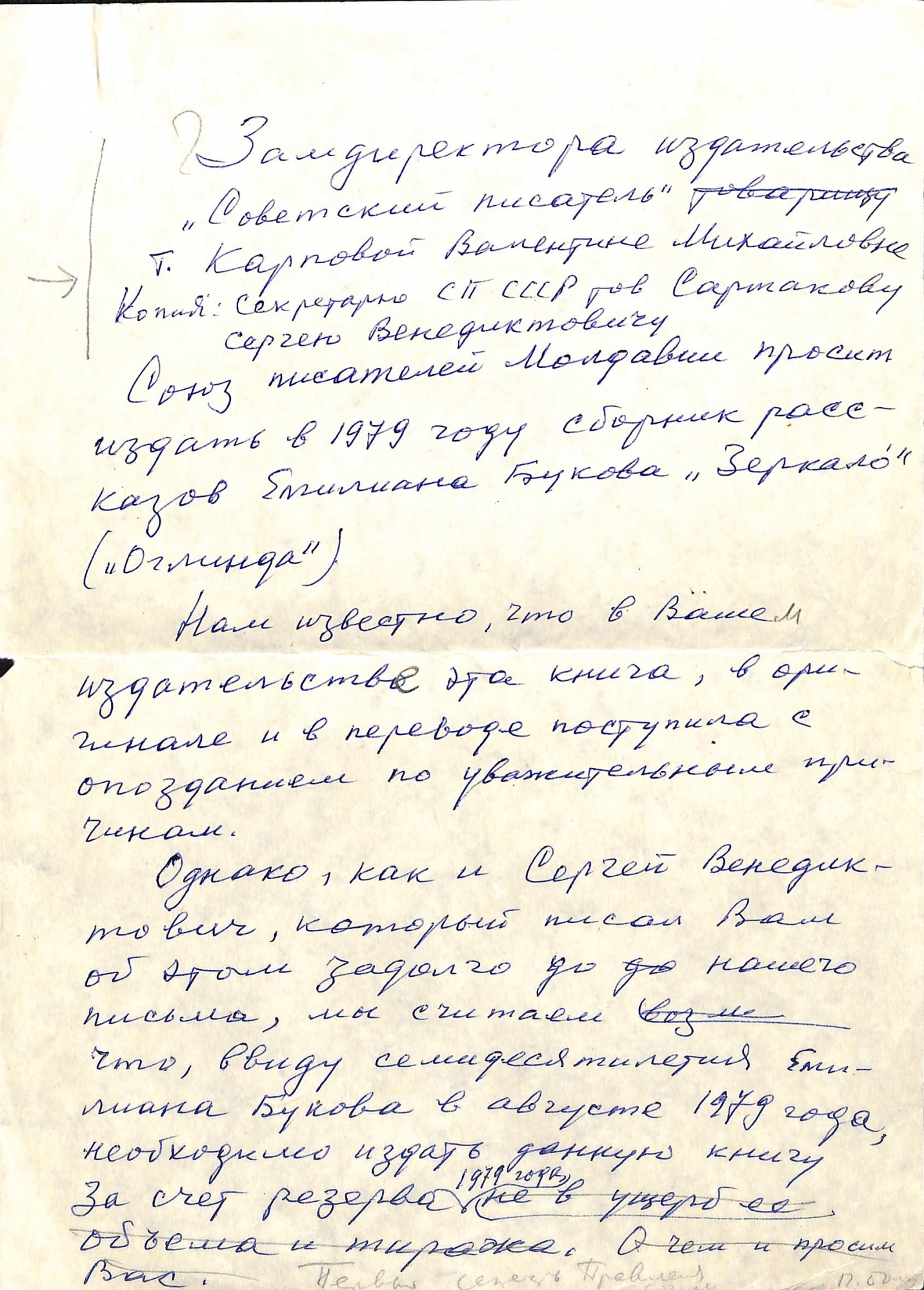 Boțu, Pavel. Scrisoare scrisă olograf de Pavel Boțu, Prim Secretar al Uniunii Scriitorilor din Moldova, către Editura „Советский писатель” și Secretariatul Uniunii Scriitorilor din URSS privind editarea în anul 1979 a cărții lui Emilian Bucov „Oglinda”. Scrisoarea este scrisă olograf în limba rusă cu stilou în culoare albastră.