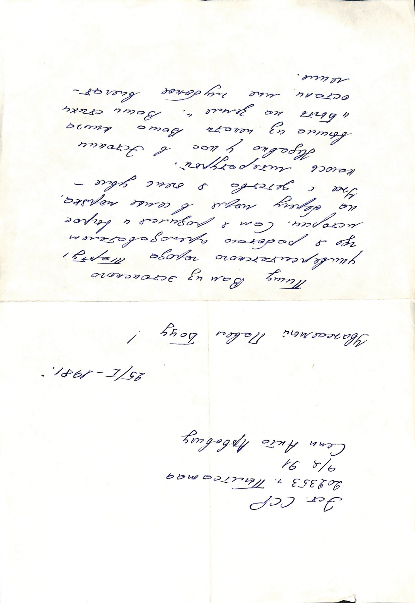 Boțu, Pavel. Scrisoare fără plic adresată lui Pavel Boțu, Prim Secretar al Uniunii Scriitorilor din Moldova din orașul Tartu, Estonia cu privire la solicitarea cărții „Быть на земле”. Scrisoarea este scrisă olograf în limba rusă cu stilou în culoare albastră. Este semnătura olograf a autorului și data: „25. I. 1981”.