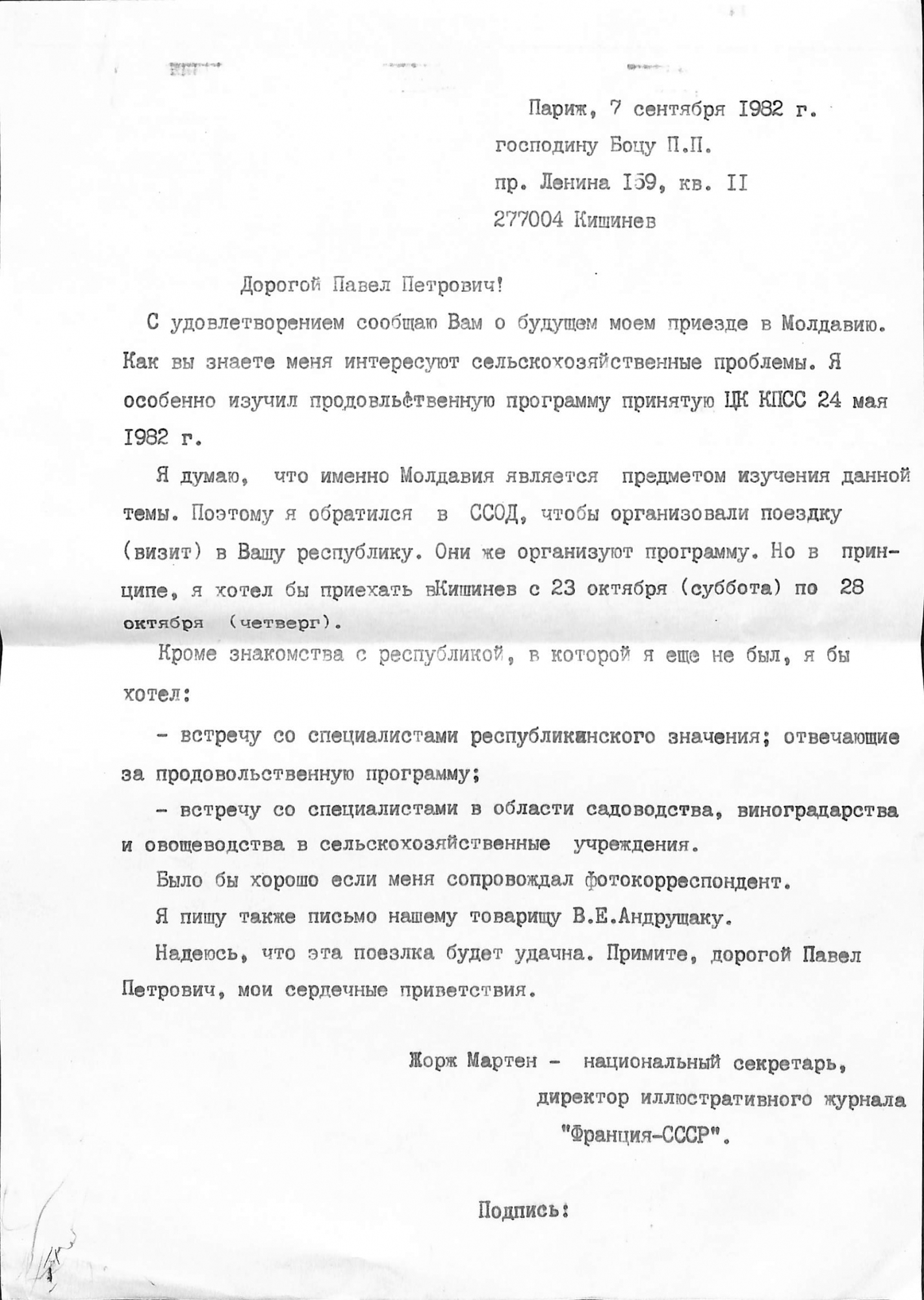 Boțu, Pavel. Manuscris dactilografiat. Scrisoare fără plic adresată lui Pavel Boțu, Președinte al Uniunii Scriitorilor din Moldova de la Jorj Marten, orașul Paris, Franța din data de 7 septembrie 1982. Scrisoarea este dactilografiată în limba rusă.