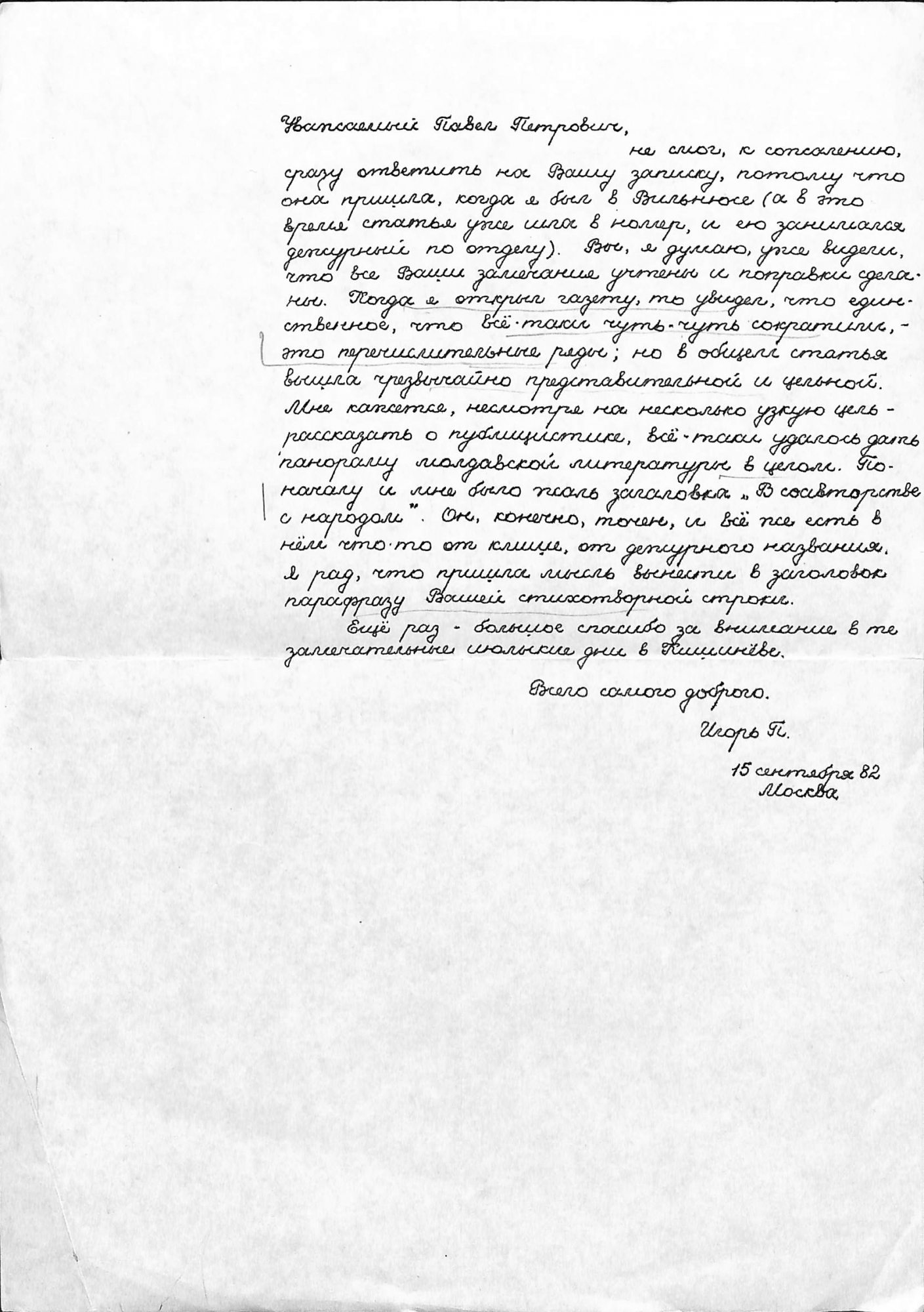Boțu, Pavel. Scrisoare adresată lui Pavel Boțu, Președinte al Uniunii Scriitorilor din Moldova, din data de 15 septembrie 1982, orașul Moscova, RFSSR. Scrisoarea este scrisă olograf în limba rusă cu stilou în cerneală neagră și datată cu: „15 сентября 82”.