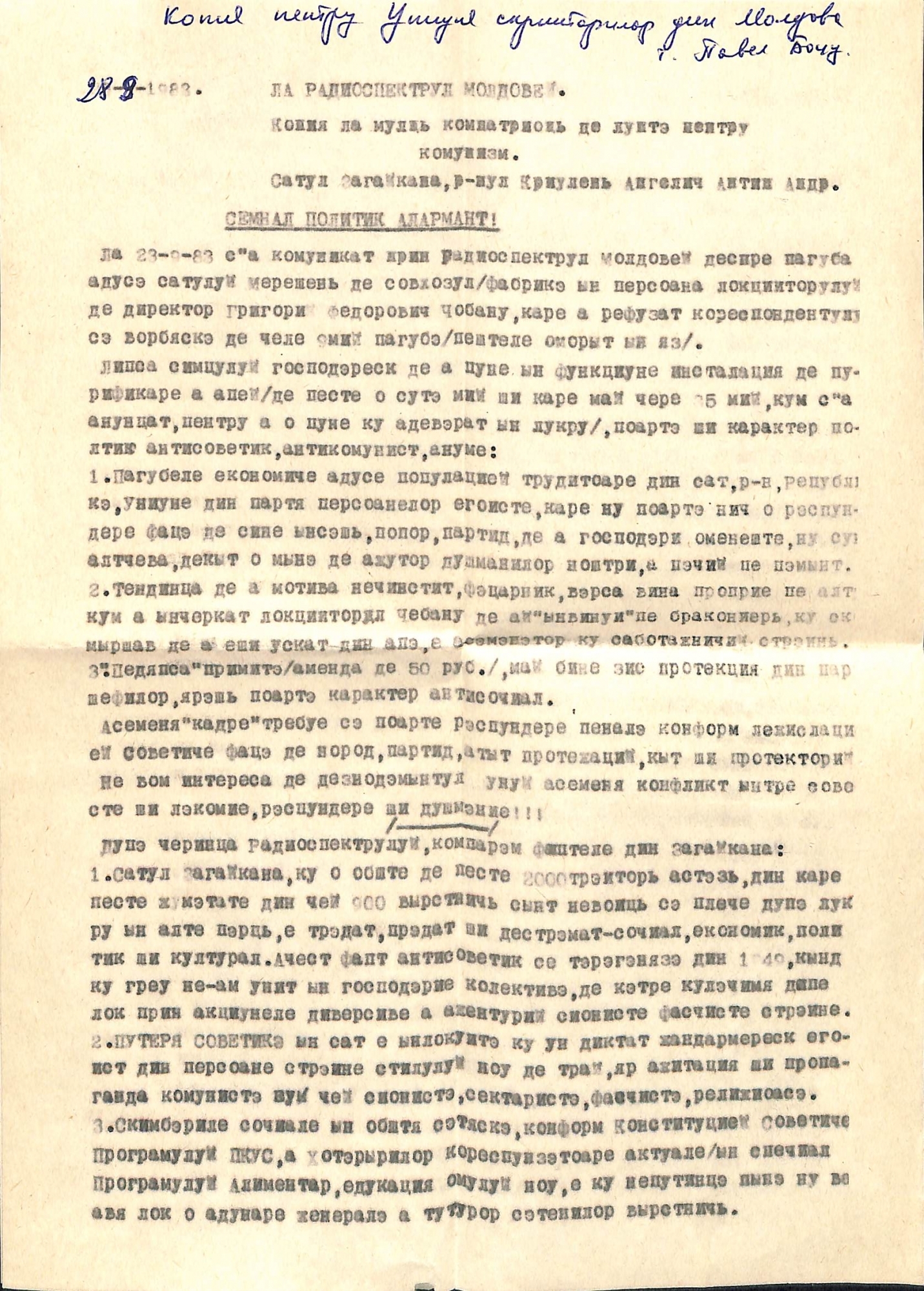 Boțu, Pavel. Manuscris dactilografiat. Scrisoare cu plic poștal adresată lui Pavel Boțu, Președinte al Uniunii Scriitorilor din Moldova de la Antip Anghelici, satul Zagaicani, raionul Criuleni din 28 septembrie 1983. Scrisoarea este dactilografiată în limba română cu caractere chirilice și completată cu scris olograf cu stilou în culoare albastră. Este semnătura olograf a autorului. Pe partea anterioară a plicului poștal sunt scrise adresele în limba română cu caractere chirilice cu stilou în culoare albastră și aplicată ștampila oficiului poștal. Pe plic este un timbru fix cu valoare nominală de patru copeici și un timbru aplicat cu valoare nominală de o copeică și legenda: „Почта СССР”. Pe partea posterioară a plicului sunt aplicate două ștampile ale oficiului poștal cu înscrisul: „Кишинёв. 30. 09. 83”. 1 plic poștal.