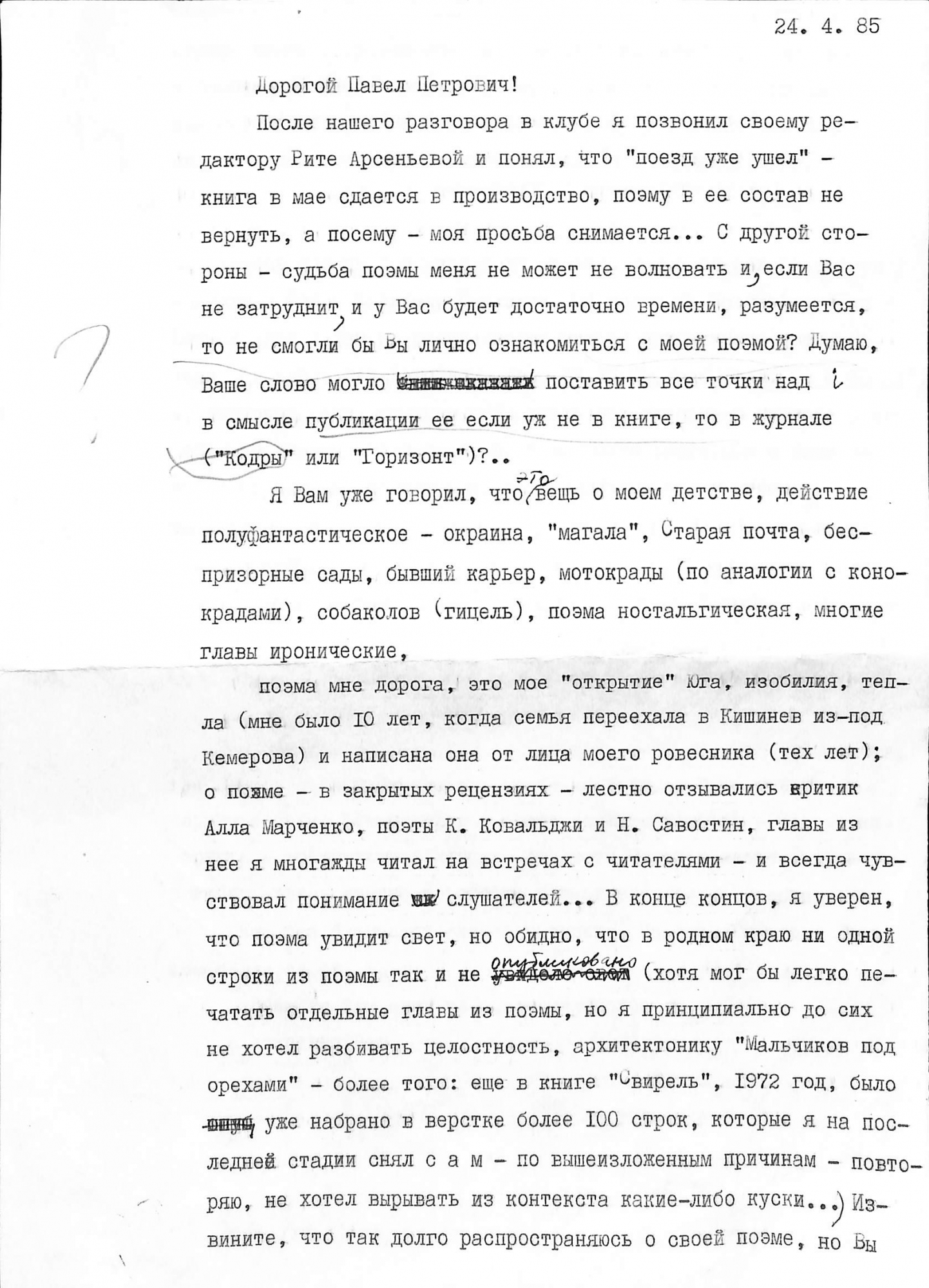 Boțu, Pavel. Manuscris dactilografiat. Scrisoare fără plic adresată lui Pavel Boțu, Președinte al Uniunii Scriitorilor din Moldova, de la Boris Victorov, orașul Moscova, RSSFR. Pe prima pagină sus, colț dreapta este indicată data: „ 24. 04. 1985”. Textul este dactilografiat în limba rusă și completat, corectat olograf cu stilou în cerneală neagră și creion simplu în culoare neagră. Este adresa poștală, numărul de telefon și semnătura olograf a autorului scrisă cu stilou în cerneală neagră. Scrisoarea: 2 p. L: 29,5 cm.; LĂ: 21 cm.; 1 plic. L: 11 cm.; LĂ: 16 cm.