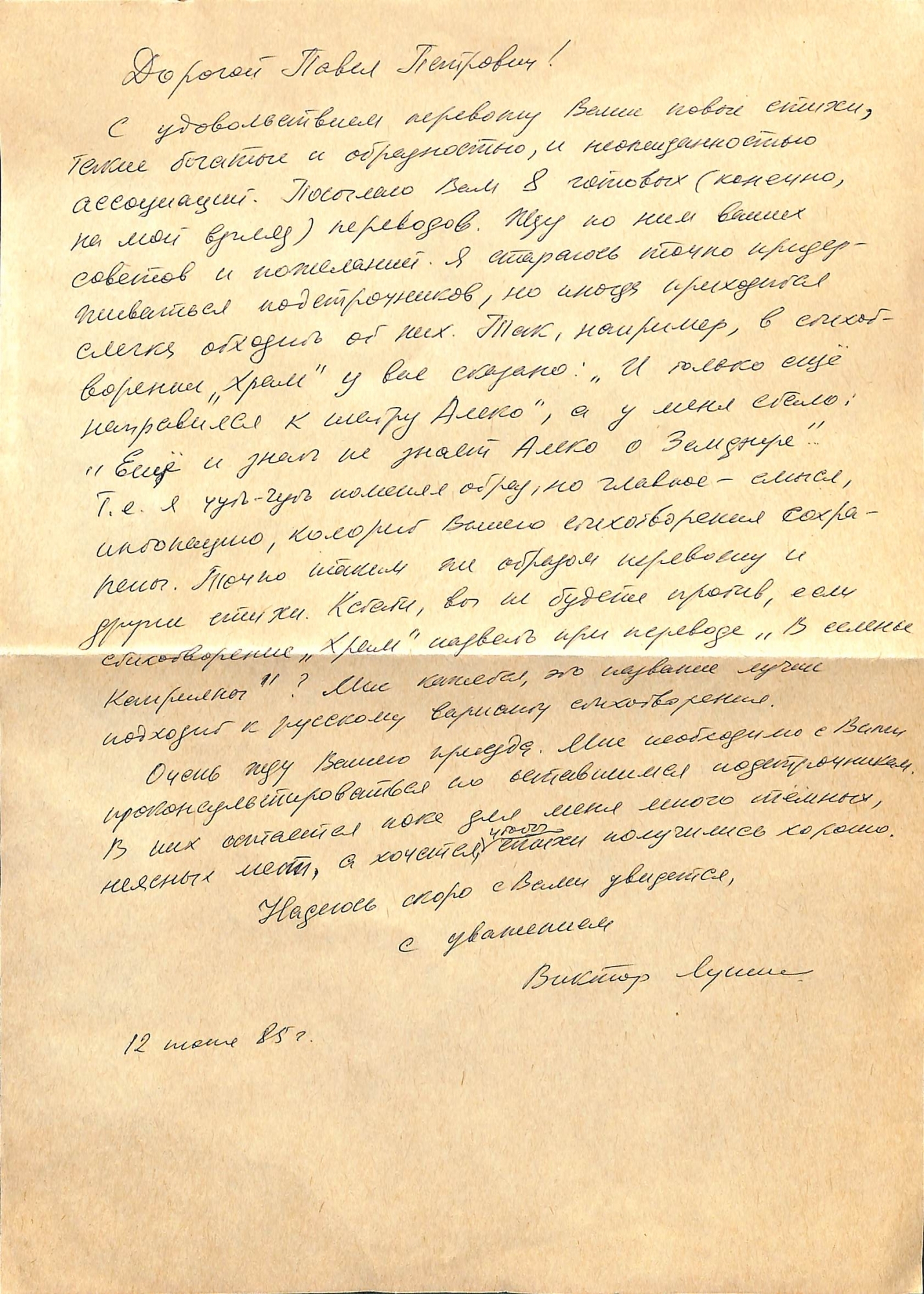 Boțu, Pavel. Manuscris olograf. Scrisoare cu plic poștal adresată lui Pavel Boțu, Președinte al Uniunii Scriitorilor din Moldova de la Victor Lunin din orașul Moscova, RSSFR din 12 iunie 1985. Textul este scris olograf în limba rusă cu stilou în culoare neagră și conține informația cu privire la preconizarea traducerii în limba rusă a poeziilor din opera lui Pavel Boțu. Este semnătura olograf a autorului scrisorii și data de 12 iunie 1985. Pe partea anterioară a plicului poștal sunt scrise adresele în limba rusă și aplicată ștampila oficiului poștal. Pe plicul poștal sunt aplicate două timbre poștale: un timbru cu valoare nominală de douăzeci de copeici pe care este scris: „Всемирный Фестиваль Молодежи и Cтудентов”, și un timbru cu valoare nominală de cinci copeici pe care este scris: „ М. А. Шолохов. 1905-1984. ПОЧТА СССР. 1985”. Pe partea posterioară a plicului este aplicată ștampila oficiului poștal. Scrisoarea: 1 p. L: 30 cm.; LĂ: 21 cm.; 1 plic. L: 16 cm.; LĂ: 22 cm.