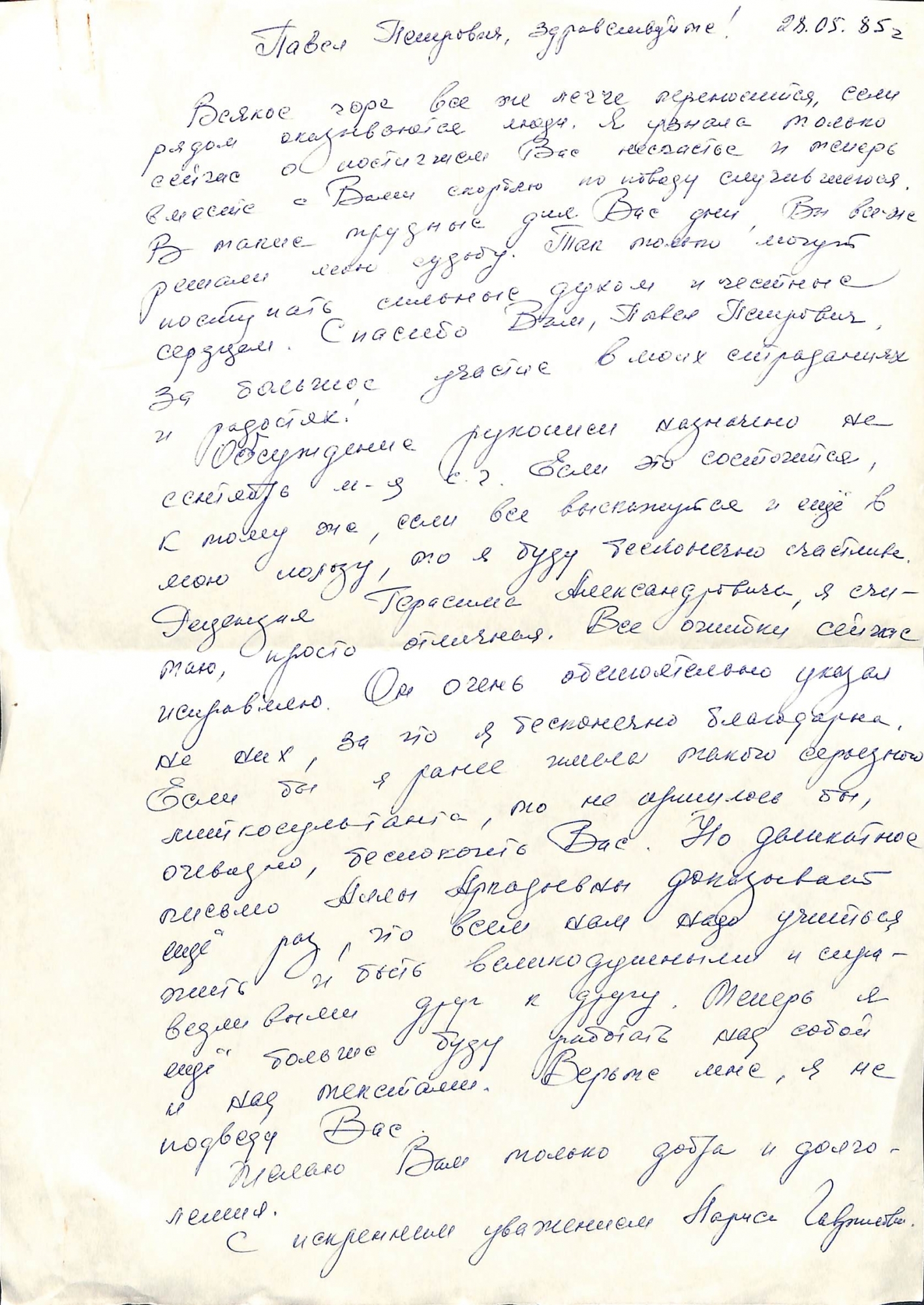 Boțu, Pavel. Manuscris olograf. Scrisoare cu plic poștal adresată lui Pavel Boțu, Președinte al Uniunii Scriitorilor din Moldova de la Larisa Gavrilova, orașul Bălți din data de 28 mai 1985. Textul este scris olograf în limba rusă cu stilou în culoare albastră. Pe partea anterioară a plicului sunt scrise adresele în limba rusă și aplicată ștampila oficiului poștal pe care este indicată data: „29. 05. 85”. Pe verso: fără informații. Scrisoarea: 1 p. L: 30 cm.; LĂ: 21 cm.; 1 plic. L: 11 cm.; LĂ: 16 cm.