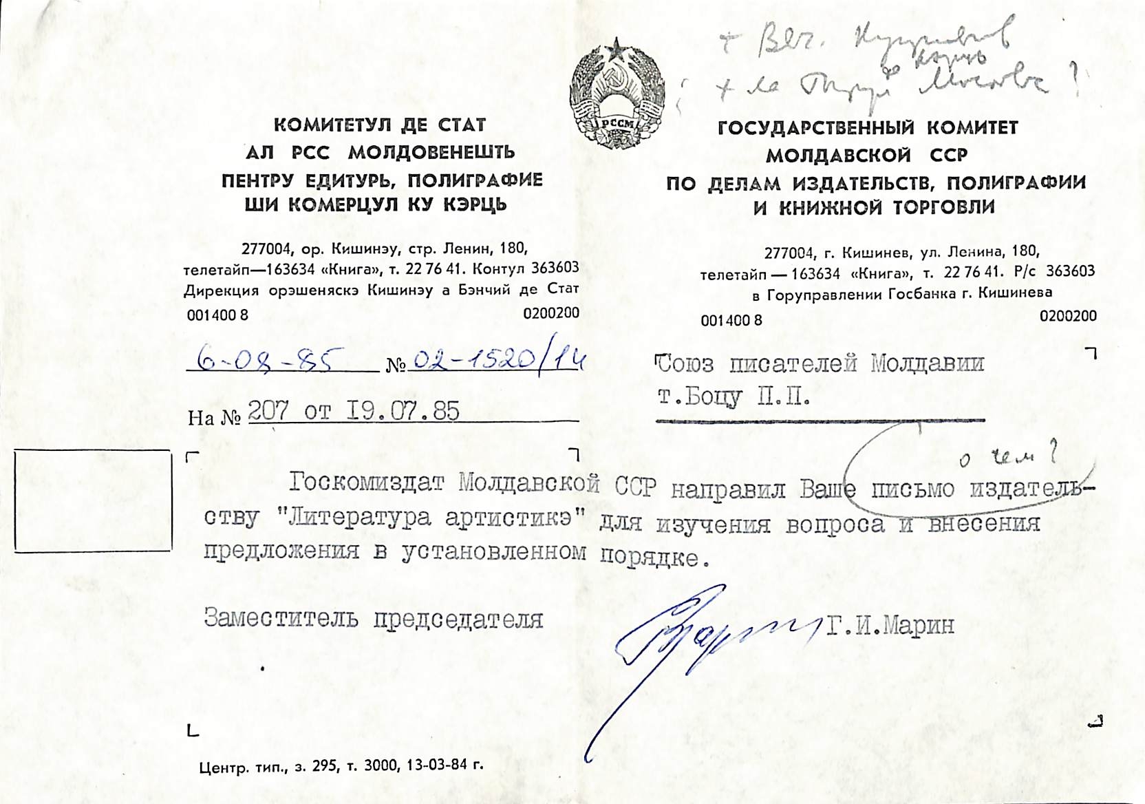 Boțu, Pavel. Manuscris dactilografiat. Scrisoare de răspuns adresată lui Pavel Boțu, Președinte al Uniunii Scriitorilor din Moldova, de la Marin G., Vice-Președinte, Comitetul de Stat al RSS Moldovenești pentru edituri, poligrafie și comerțul cu cărți, cu nr.02-1520/14 din 06.08.1985, răspuns la nr. 207 din 19.07.1985. Documentul este inserat pe formular-tip cu antetul instituției, sus la mijloc este imprimată stema RSSM. Scrisoarea este dactilografiată în limba rusă și semnată cu scris olograf cu stilou în culoare albastră. 1 p. L:14,5 cm.; LĂ:21 cm.