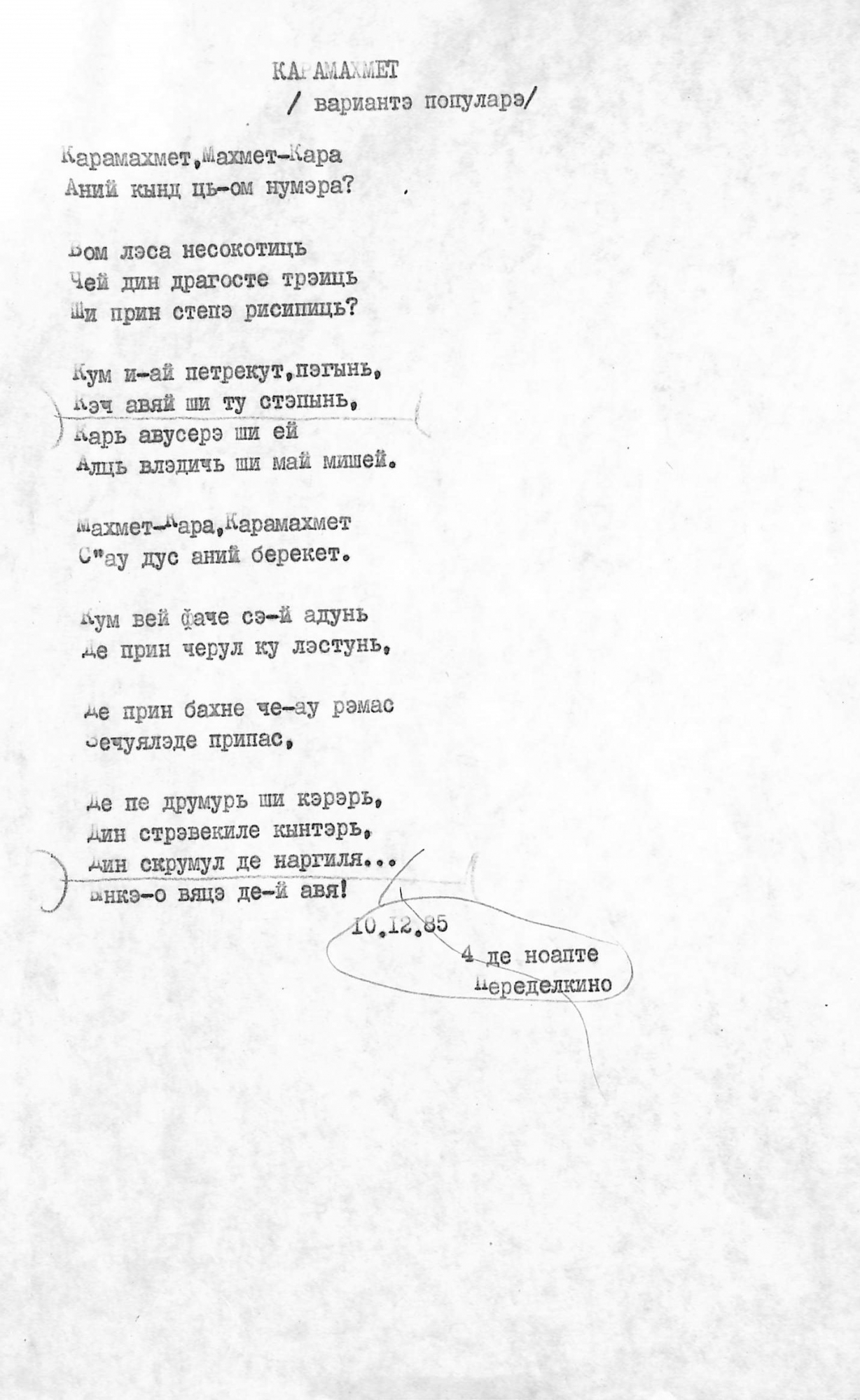 Boțu, Pavel. Manuscris dactilografiat. Poezia „KARAMAHMET” (variantă populară) de Pavel Boțu este inserată pe o pagină, iar mai jos este înscris: „10.12.85. 4 de noapte. Peredelkino”. Manuscrisul dactilografiat este scris în limba română cu caractere chirilice și corectări scrise olograf cu creion simplu în culoare neagră.