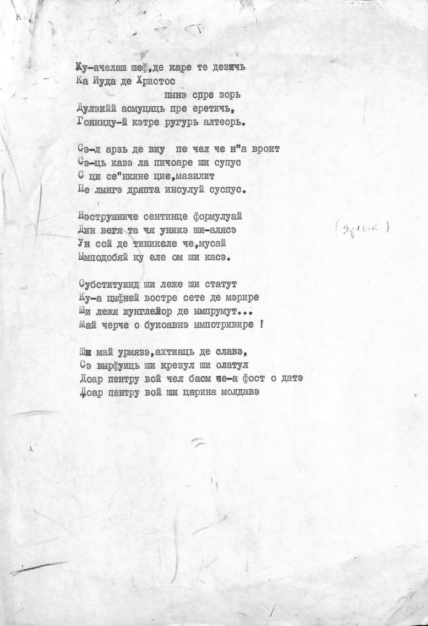 Boțu, Pavel. Manuscris dactilografiat. Poezia fără titlu este înserată pe o pagină: „...Cu același șef de care te dezici...”. Manuscrisul dactilografiat este scris în limba română cu caractere chirilice, urmat de o hârtie indigo cu poezia imprimată pe hârtia în culoare neagră. Fără datare.
