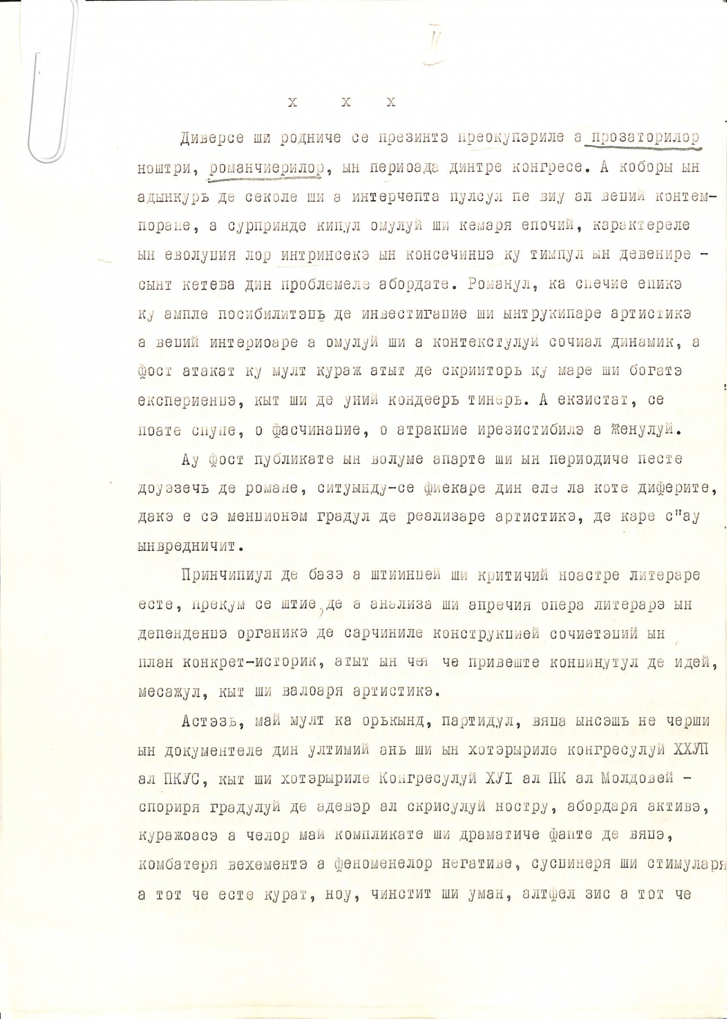 Boțu, Pavel. Manuscris dactilografiat. Compartimentul al doilea din Raportul prezentat de Pavel Boțu la Congresul VII al scriitorilor din Moldova relevă: „Diverse și rodnice se prezintă preocupările prozatorilor noștri, romancierilor, în perioada dintre congrese...”. Manuscrisul dactilografiat este scris în limba română cu caractere chirilice și corectări olograf cu creion simplu în culoare neagră. Fără datare. 13 p.