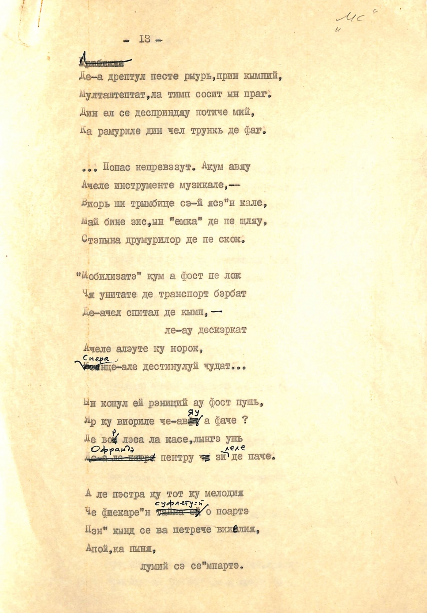 Boțu, Pavel. Manuscris dactilografiat. Poezie, titlul este ilizibil „...De-a dreptul peste râuri, prin câmpii...” - înserată pe trei pagini. Manuscrisul dactilografiat este scris în limba română cu caractere chirilice, cu corectări olograf scrise cu stilou în culoare neagră. Fără datare.