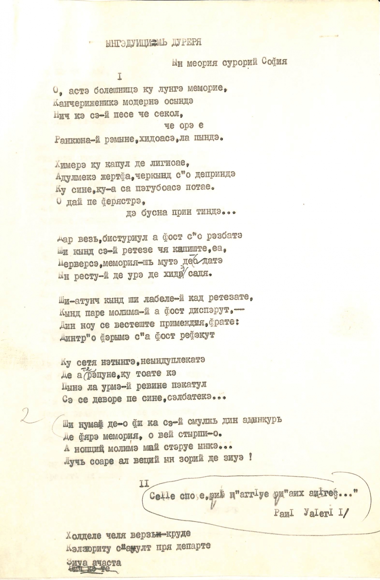 Boțu, Pavel. Manuscris dactilografiat. Poezia „Îngăduiți-mi durerea”. În memoria surorii Sofia. Manuscrisul este inserat pe două pagini și cuprinde două părți, iar mai jos este înscris: „20. 5. 85. Ciamașir. 30. II. 85. Peredelkino”. Manuscrisul dactilografiat este scris în limba română cu caractere chirilice și corectări scrise olograf cu creion simplu în culoare neagră.