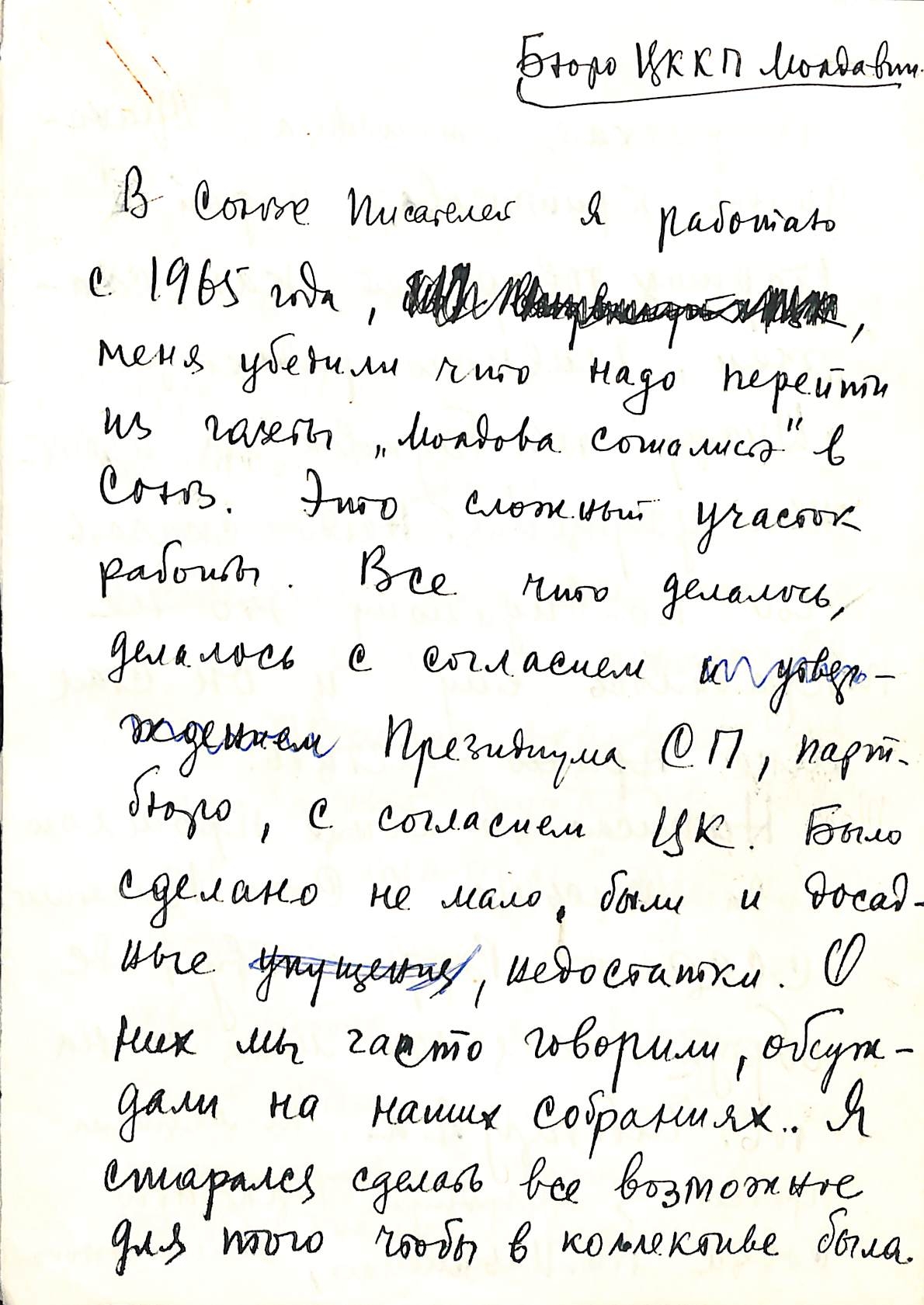 Boțu, Pavel. Manuscris olograf. Raport prezentat de scriitorul Pavel Boțu. Pe prima pagină a manuscrisului olograf, sus colț dreapta este scris: „Бюро ЦК КП Молдавии”. Manuscrisul olograf este scris în limba rusă cu stilou în cerneală neagră. Fără datare. 7 p.