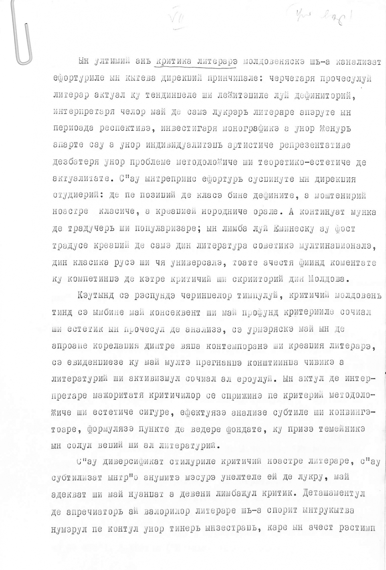 Boțu, Pavel. Manuscris dactilografiat. Compartimentul al șaptelea din Raportul prezentat de Pavel Boțu la Congresul VII al scriitorilor din Moldova relevă: „...critica literară moldovenească...”. Manuscrisul este dactilografiat în limba română cu caractere chirilice și corectări scrise olograf cu creion simplu în culoare neagră. Fără datare.