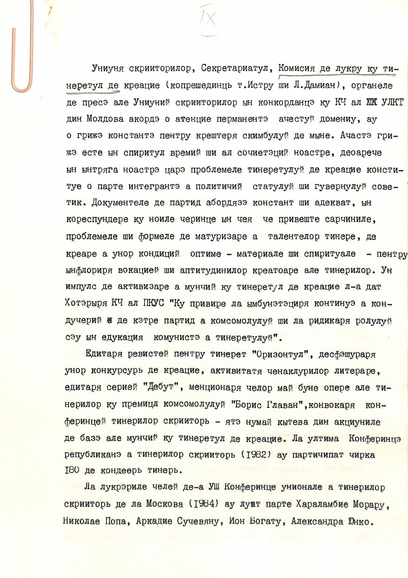 Boțu, Pavel. Manuscris dactilografiat. Partea a noua din referatul prezentat de Pavel Boțu reflectă: „Uniunea Scriitorilor, Secretariatul, Comisia de lucru cu tineretul de creație... au o grijă constantă pentru creșterea schimbului de mâine...problemele tineretului de creație constituie o parte integrantă a politicii statului...”. Manuscrisul este dactilografiat în limba română cu caractere chirilice și corectări scrise olograf cu creion simplu în culoare neagră. Fără datare.