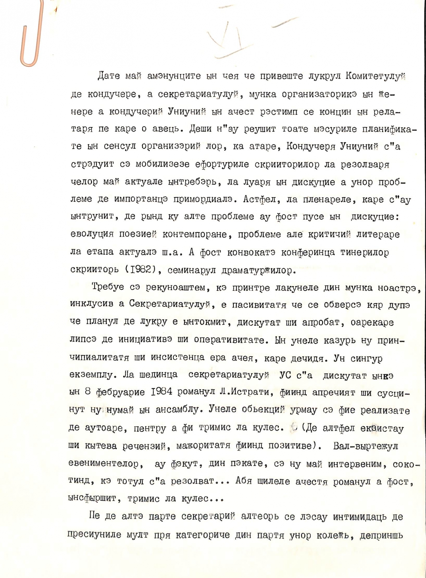 Boțu, Pavel. Manuscris dactilografiat. Compartimentul al unsprezecelea din Raportul prezentat de Pavel Boțu la Congresul VII al scriitorilor din Moldova elucidează: „...lucrul Comitetului de conducere, a secretariatului, munca organizatorică în genere a conducerii Uniunii...”. Manuscrisul este dactilografiat în limba română cu caractere chirilice și corectări scrise olograf cu creion simplu în culoare neagră.