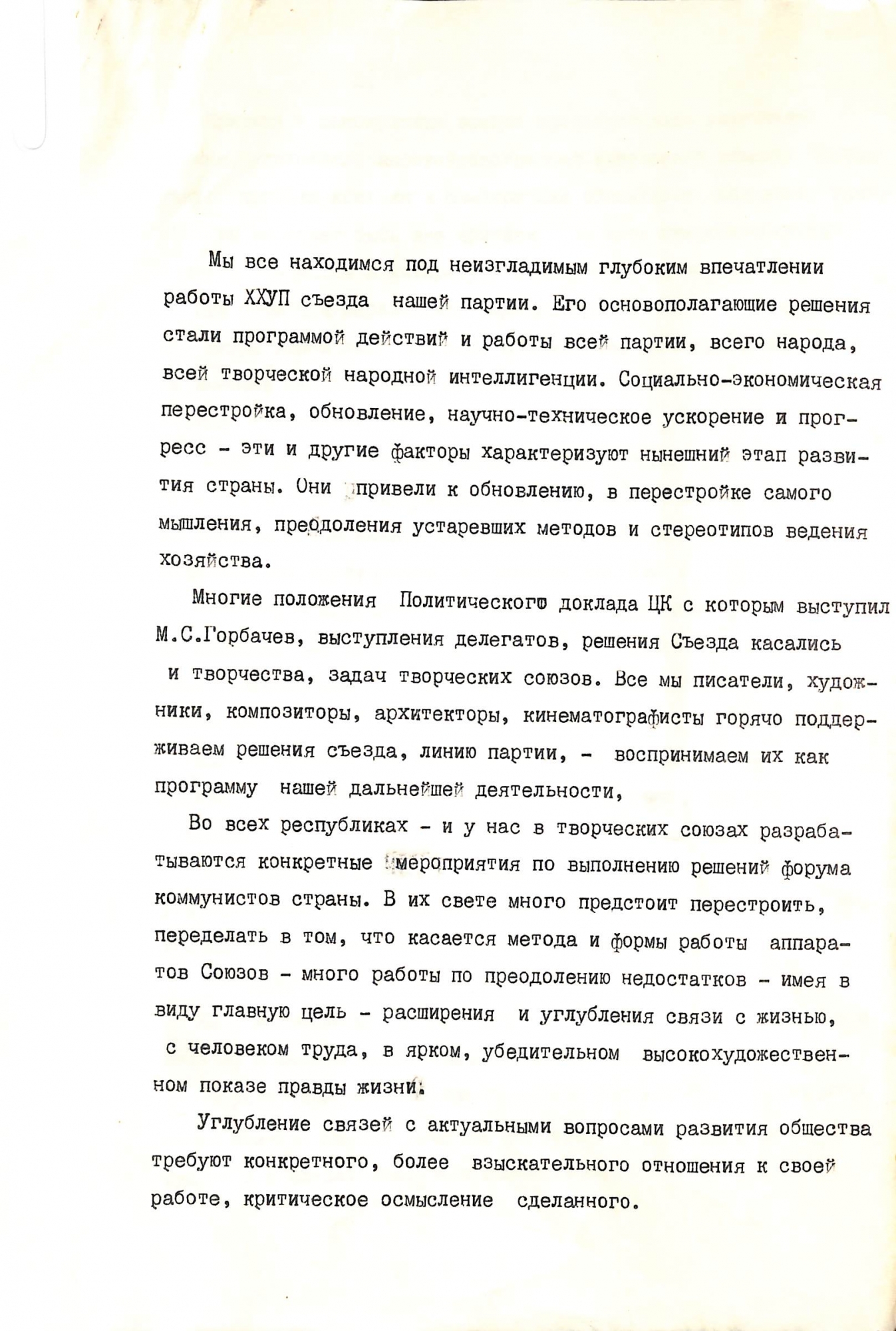 Boțu, Pavel. Manuscris dactilografiat. Manuscrisul este scris în limba rusă și conține un mesaj introductiv la ședința cu privire la rezultatele și hotărârile congresului al XXVII al PCUS. În discursul introductiv se menționează despre raportul politic prezentat de M. S. Gorbaciov și hotărârile congresului în anexele cărora sunt vizate și activitatea uniunilor de creație etc. Raportor la ședința vizată a fost Secretarul II al PCM - Smirnov V. I., care a participat la congresul al XXVII al PCUS. Fără datare.