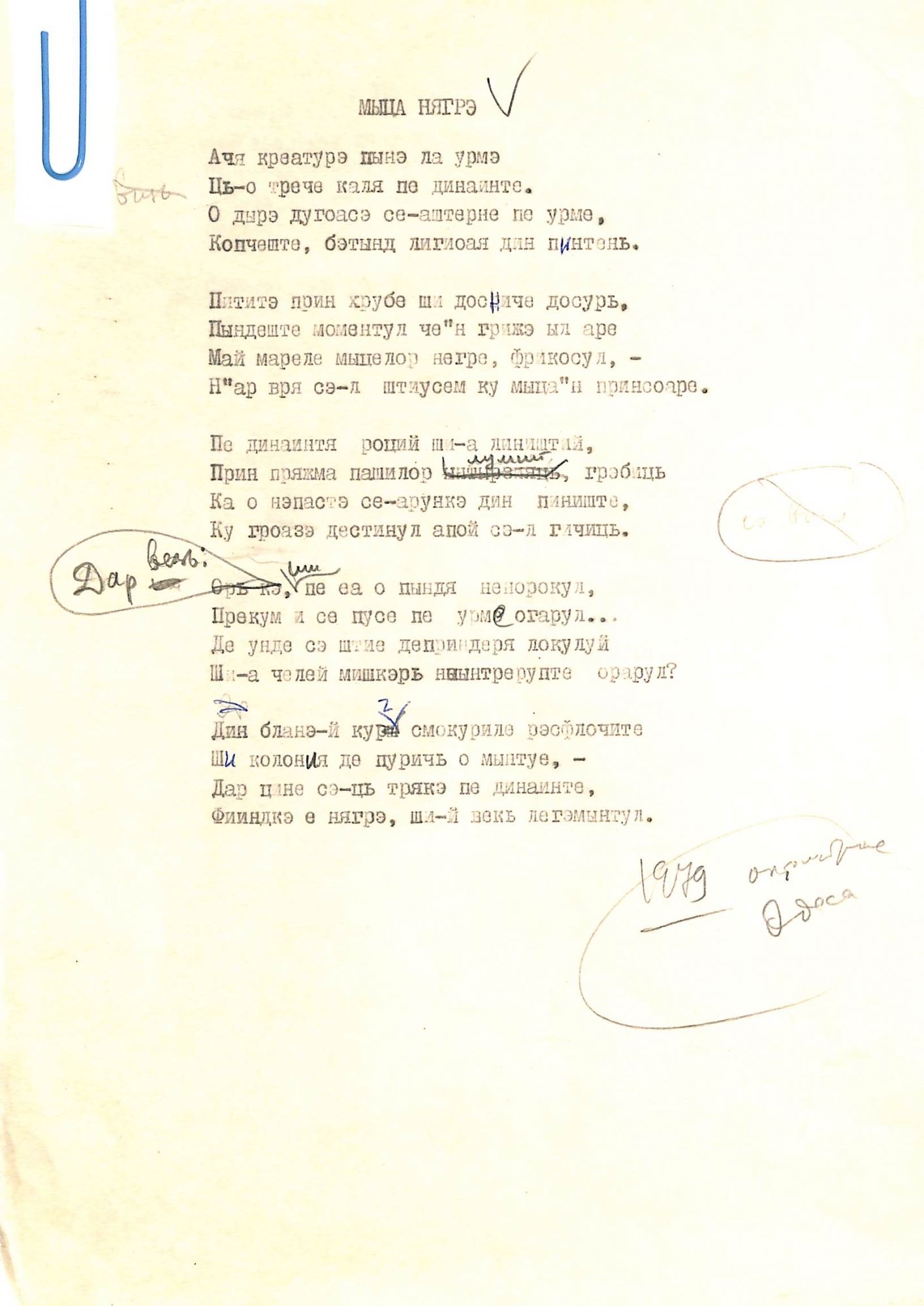 Boțu, Pavel. Manuscris dactilografiat. Poezia: „ Mâța neagră” de Pavel Boțu cuprinde cinci strofe, înserate pe o pagină, iar mai jos este scris olograf cu creion simplu în culoare neagră: „1979 octombrie. Odesa”. Manuscrisul dactilografiat este scris în limba română cu caractere chirilice, cu corectări olograf cu creion simplu în culoare neagră și stilou în culoare albastră.