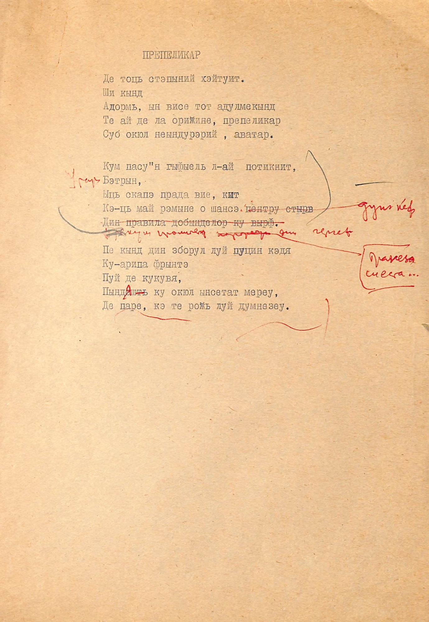 Boțu, Pavel. Manuscris dactilografiat. Poezia „Prepelicar” de Pavel Boțu este înserată pe o pagină. Manuscrisul dactilografiat este scris în limba română cu caractere chirilice, cu corectări olograf scrise cu stilou în culoare roșie. Fără datare.