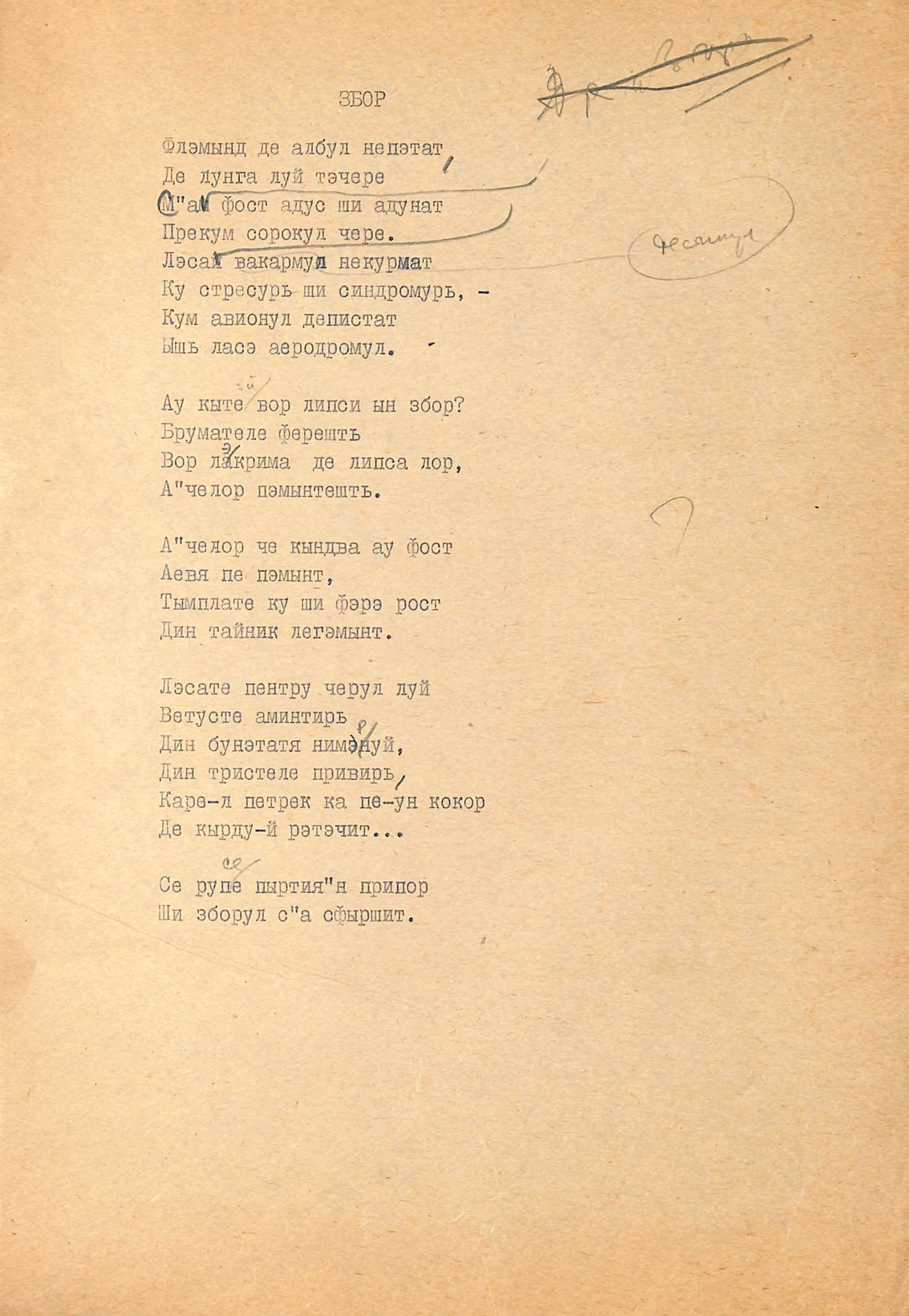 Boțu, Pavel. Manuscris dactilografiat. Poezia „Zbor” este înserată pe o pagină. Manuscrisul dactilografiat este scris în limba română cu caractere chirilice, cu corectări olograf scrise cu creion simplu în culoare neagră. Fără datare.