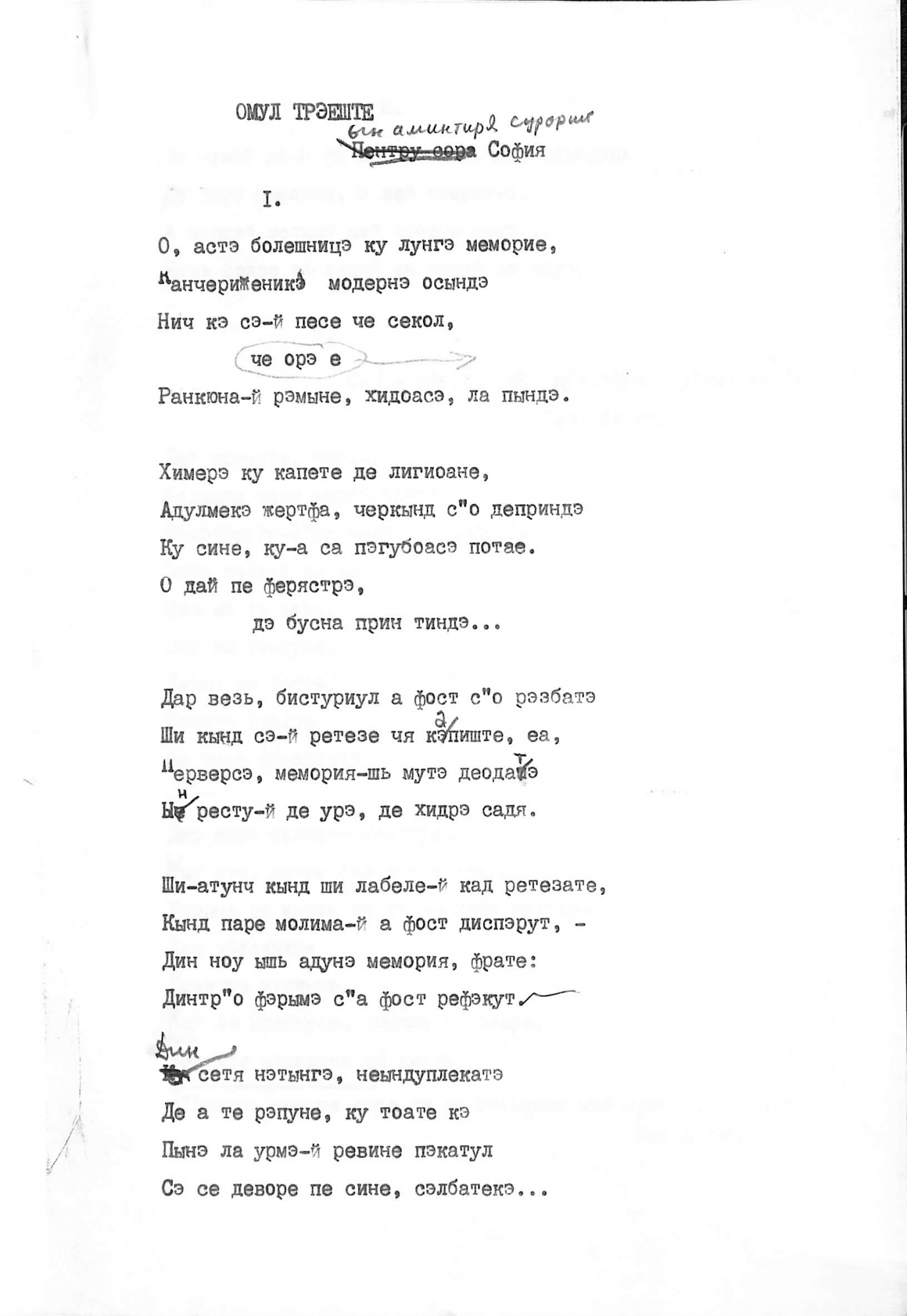 Boțu, Pavel. Manuscris dactilografiat. Poezia „Omul trăiește” de Pavel Boțu este inserată pe trei pagini și cuprinde trei părți, în amintirea surorii Sofia. Manuscrisul dactilografiat este scris în limba română cu caractere chirilice și corectări scrise olograf cu stilou în cerneală neagră și creion simplu în culoare neagră. Fără datare.