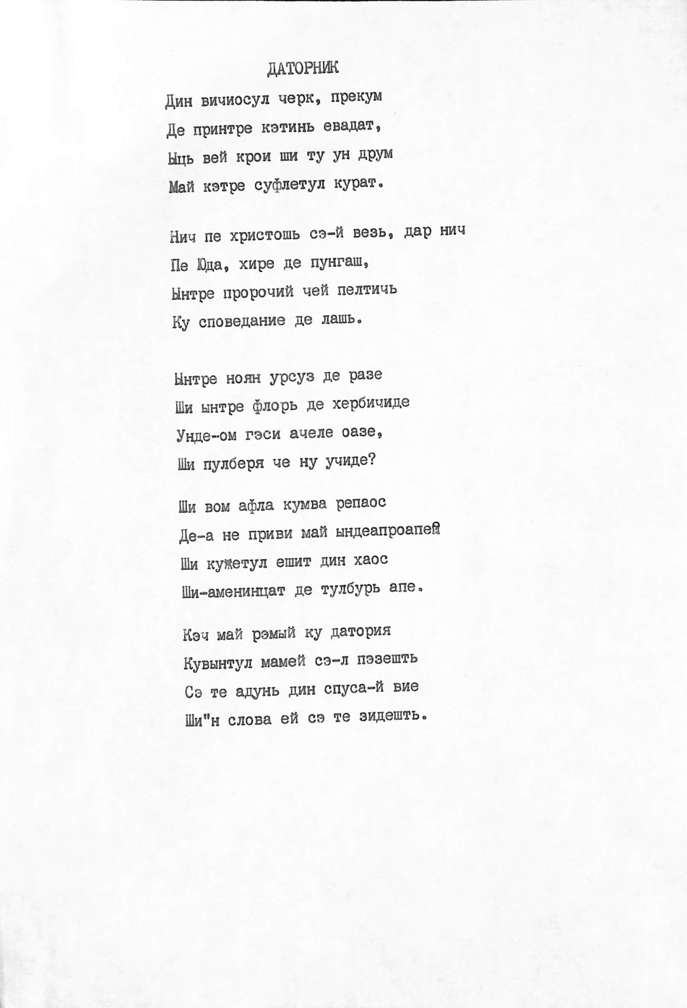 Boțu, Pavel. Manuscris dactilografiat. Poezia „Datornic” de Pavel Boțu este inserată pe o pagină și cuprinde cinci strofe. Manuscrisul dactilografiat este scris în limba română cu caractere chirilice. Fără datare.