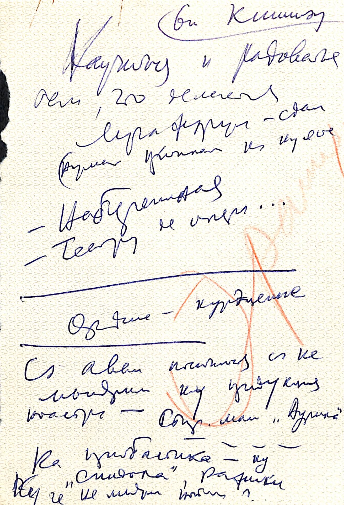 Boțu, Pavel. Manuscris olograf. Notițe varia: „În Chișinău... Să avem...”, manuscris olograf scris pe hârtie de carnet cu sigla pe verso: „XXVI съезд КПСС”. Manuscrisul olograf este scris în limba română cu caractere chirilice și în limba rusă cu stilou în culoare albastră și creion în culoare roșie. Fără datare.