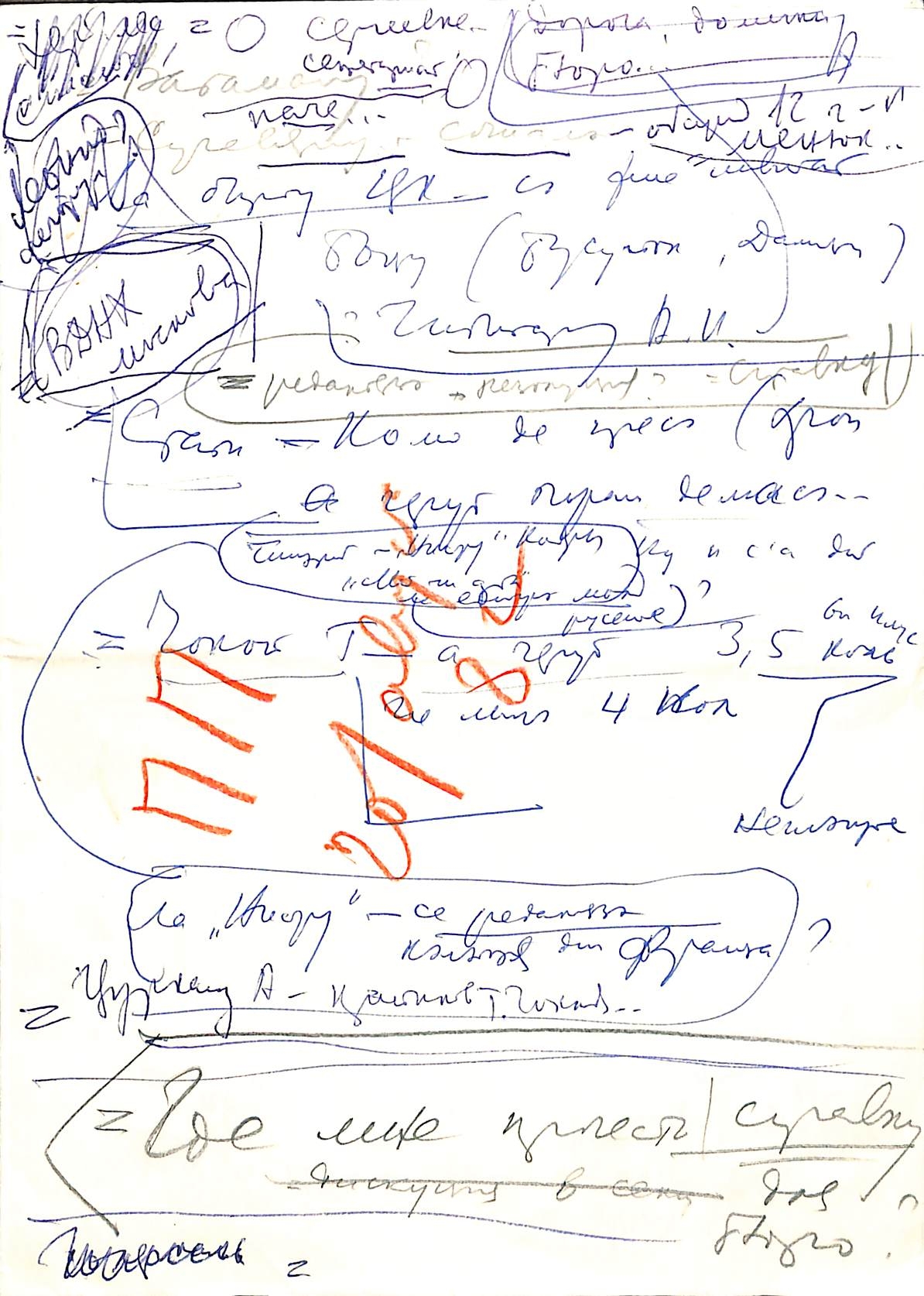 Boțu, Pavel. Manuscris olograf. Manuscrisul cuprinde note varia scrise olograf pe patru pagini. Pe prima pagină la mijloc este scris cu creion în culoare roșie: „ P. P. 20/august 82”. Manuscrisul olograf este scris în limba română cu caractere chirilice și în limba rusă cu stilou în culoare albastră, și cu creion în culorile negru și roșu.