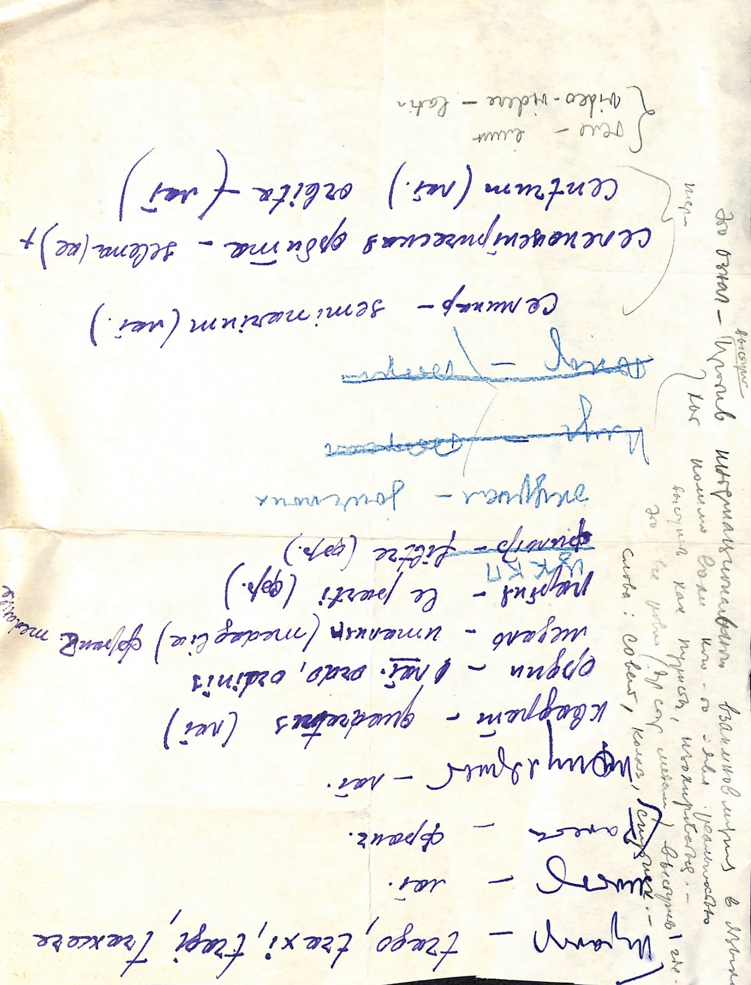 Boțu, Pavel. Manuscris olograf. Manuscrisul cuprinde notițe, studii de limbi, micro-dicționar scrise olograf pe o pagină format A4. Manuscrisul olograf este scris în mai multe limbi cu stilou în culoare albastru-violet și cu creion în culorile negru și albastru. Fără datare.