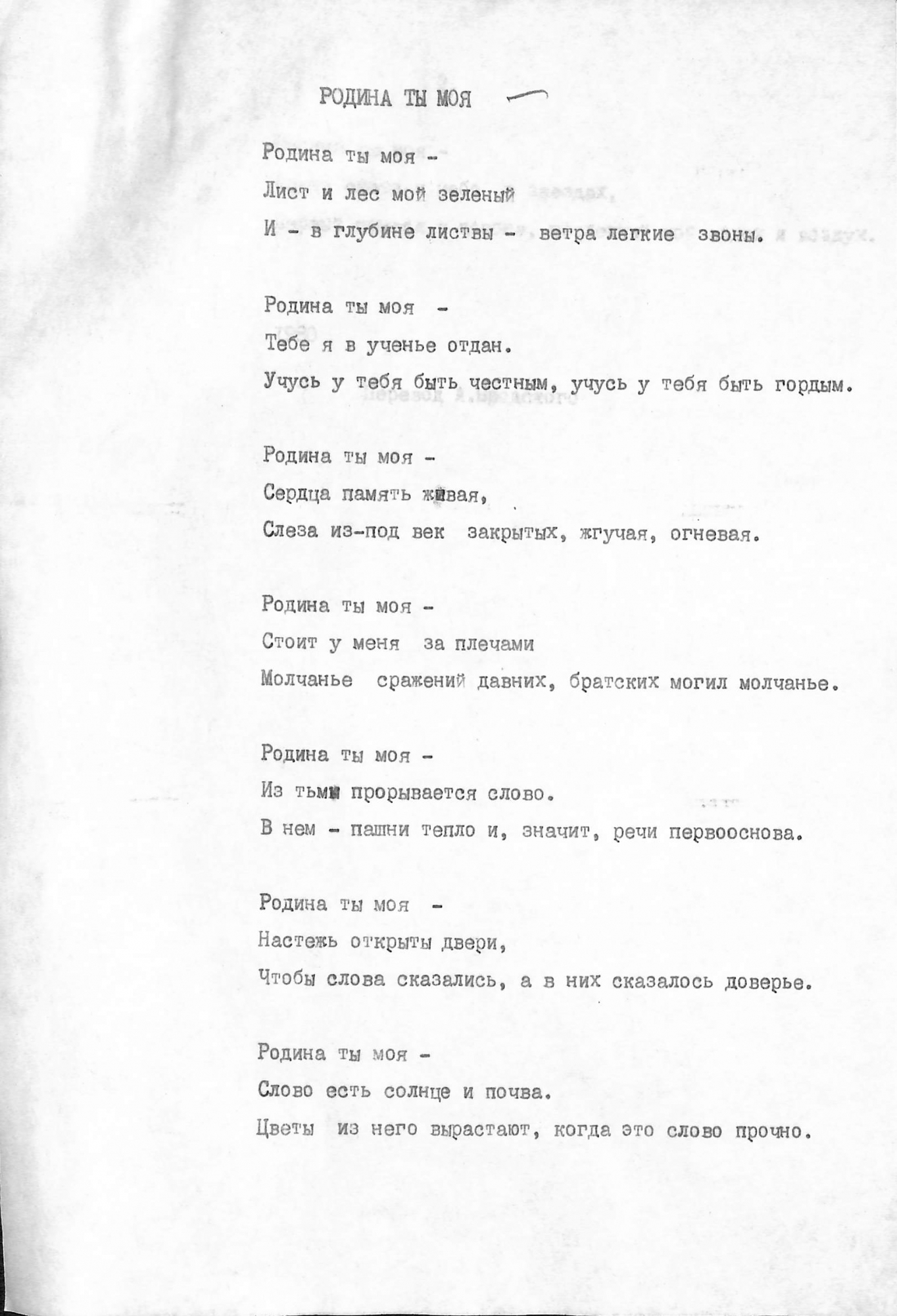 Boțu, Pavel. Manuscris dactilografiat. Poezia „РОДИНА ТЫ МОЯ” este tradusă în limba rusă de Alexandr Brodskii. Poezia este inserată pe două pagini și este dactilografiată în limba rusă. În partea inferioară a paginii a doua este dactilografiat: „1980 Перевод А. Бродского”.