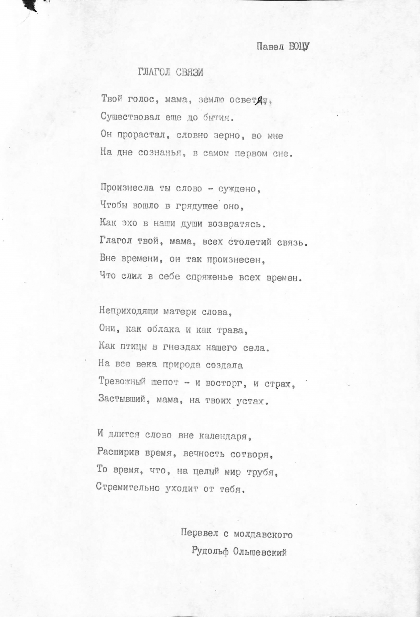 Boțu, Pavel. Manuscris dactilografiat. Poezia „ГЛАГОЛ СВЯЗИ” este tradusă în limba rusă de Rudolf Olișevskii. Poezia cuprinde patru strofe și este dactilografiată în limba rusă, corectată cu scris olograf scris cu stilou în culoare albastră. În partea superioară a paginii, sus colț dreapta este indicat autorul: Pavel BOȚU. După ultima strofă, mai jos este dactilografiat: „Перевел с молдавского Рудольф Ольшевский”. Fără datare.
