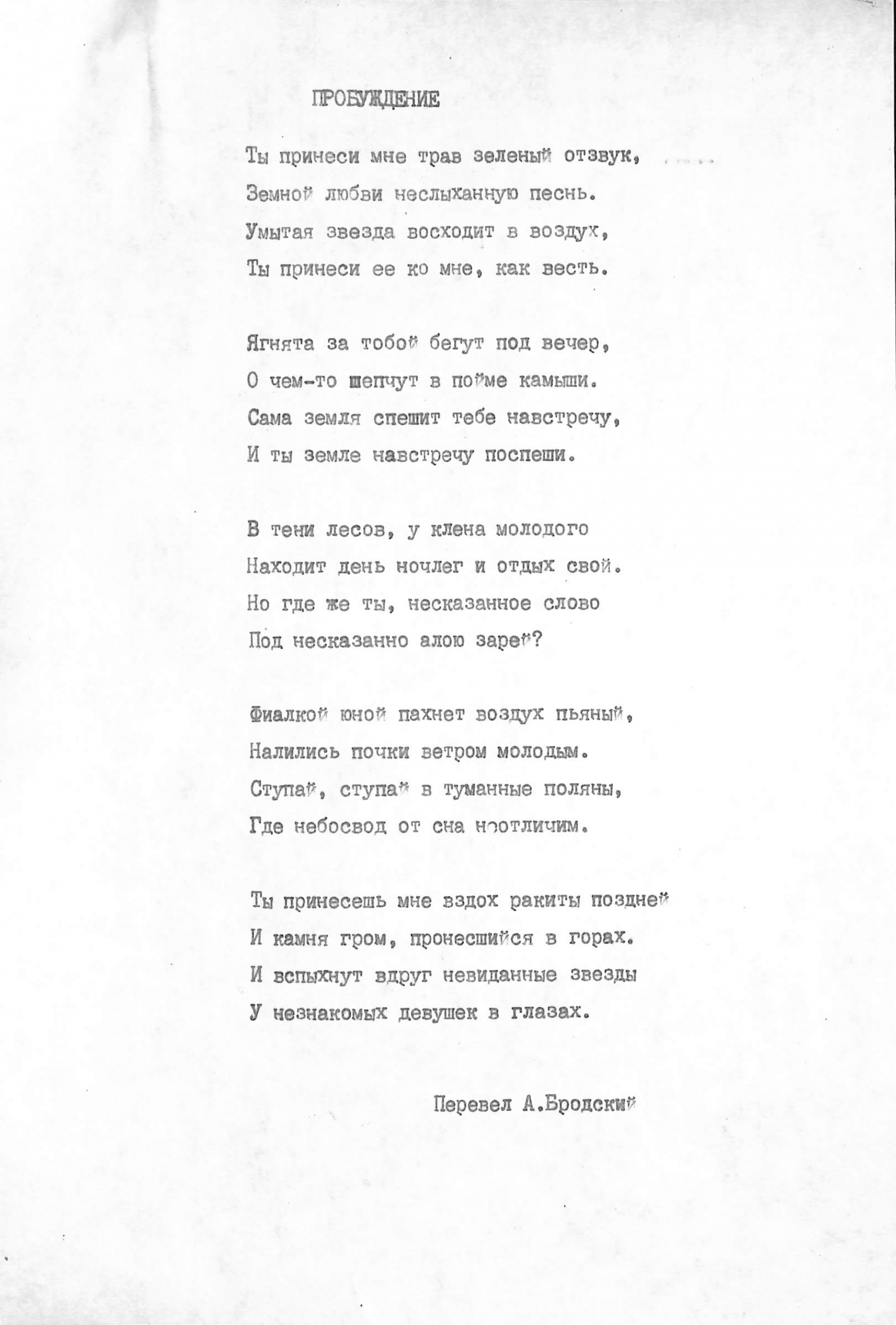 Boțu, Pavel. Manuscris dactilografiat. Poezia „ПРОБУЖДЕНИЕ” este tradusă în limba rusă de Alexandr Brodskii. Poezia cuprinde cinci strofe și este dactilografiată în limba rusă. În partea inferioară a paginii este dactilografiat: „Перевел А. Бродский”. Fără datare.