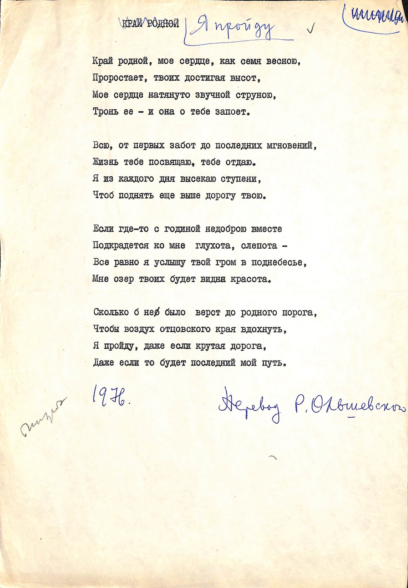 Boțu, Pavel. Manuscris dactilografiat. Poezia „КРАЙ РОДНОЙ” este tradusă în limba rusă de Rudolf Olișevskii. Poezia cuprinde patru strofe și este dactilografiată în limba rusă, și corectată cu scris olograf scris cu stilou în culoare albastră. După ultima strofă, mai jos este scris olograf cu stilou în culoare albastră: „1976. Перевод Р. Ольшевского”.