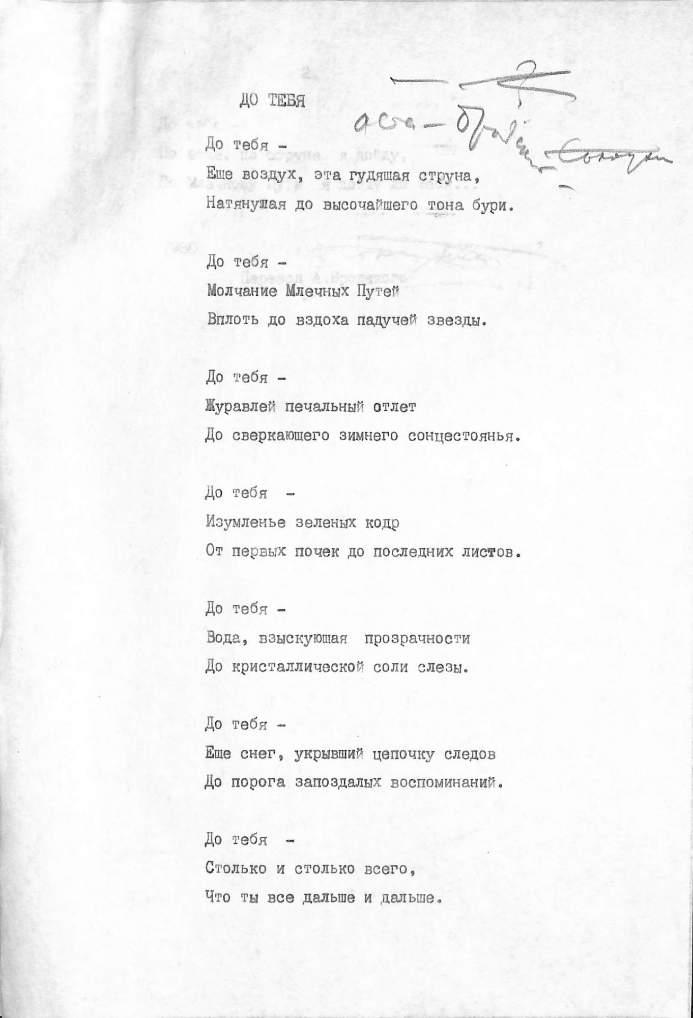 Boțu, Pavel. Manuscris dactilografiat. Poezia „ДО ТЕБЯ” este tradusă în limba rusă de Alexandr Brodskii. Poezia este inserată pe două pagini și este dactilografiată în limba rusă. Pe prima pagină sus, colț dreapta este scris ilizibil olograf scris cu creion în culoare neagră. În partea inferioară a paginii a doua este dactilografiat: „1980 Перевод А. Бродского”.
