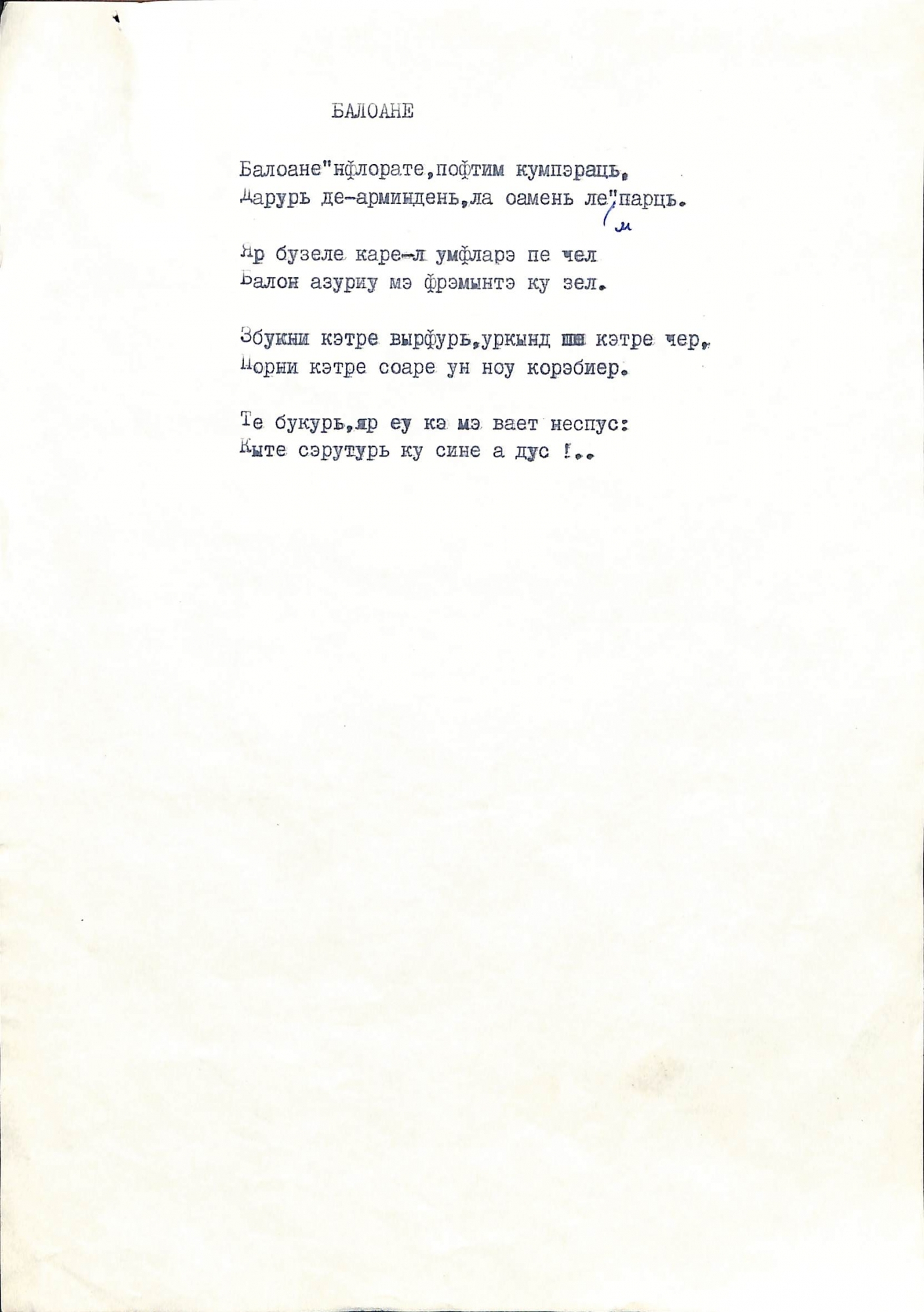 Boțu, Pavel. Manuscris dactilografiat. Poezia „BALOANE” de Maxim TANK este tradusă de scriitorul Pavel Boțu. Poezia cuprinde patru strofe și este dactilografiată în limba română cu caractere chirilice și corectată cu scris olograf scris cu stilou în culoare albastră. Fără datare.