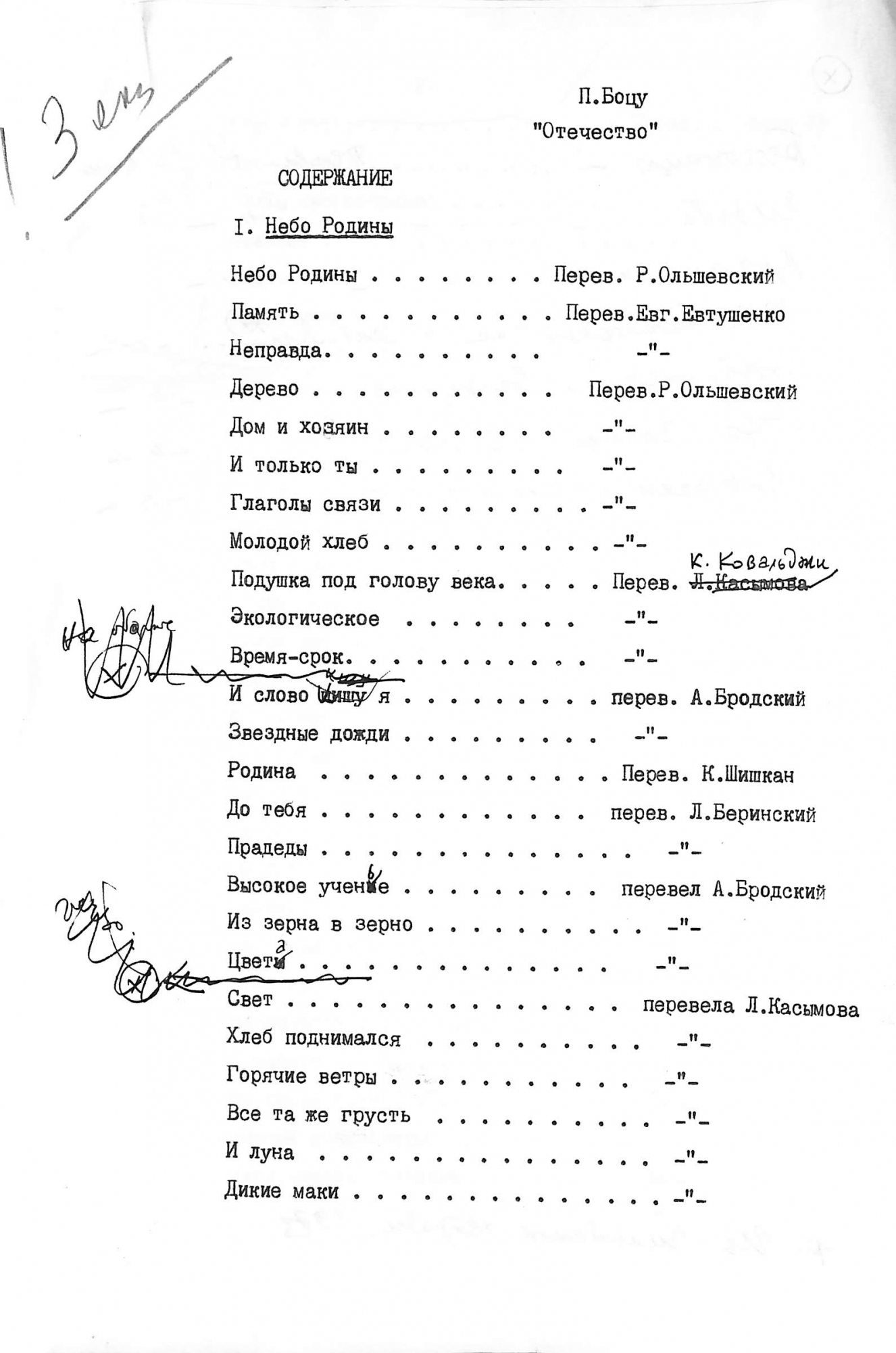 Boțu, Pavel. Manuscris dactilografiat. Proiectul cărții lui Pavel BOȚU: „ОТЕЧЕСТВО”. Manuscrisul este dactilografiat în limba rusă și corectat olograf cu stilou în cerneală neagră, și creion simplu în culoare neagră. Pe prima pagină, sus colț stânga este scris olograf cu creion în culoare neagră: „! 3 екз”, iar în partea dreaptă este dactilografiat: „П. БОЦУ. „Отечество””. Mai jos, după numele autorului și titlul cărții este inserat Cuprinsul Cărții: „ОТЕЧЕСТВО”. Proiectul Cărții cuprinde Trei Părți: I. „Небо Родины”; II. „Я посажу оливу”; III. „Солдаты связи – поэма”. 1987.