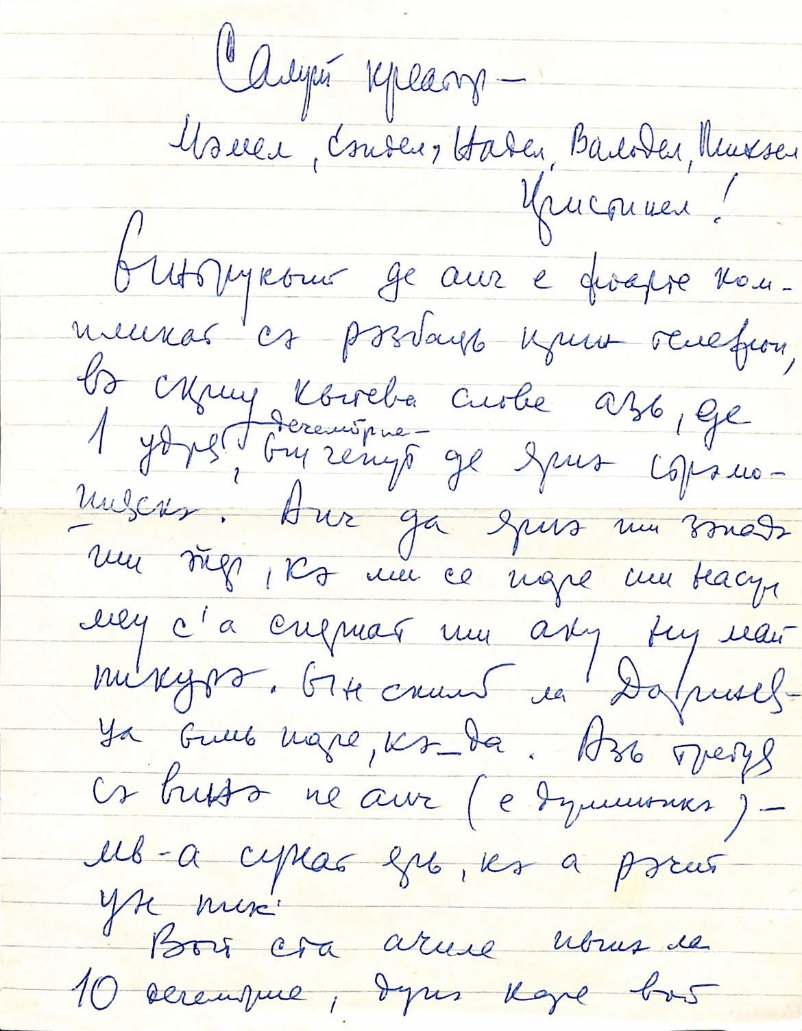 Boțu, Pavel. Manuscris olograf. Scrisoare scrisă olograf de Pavel Boțu către membrii familiei (Casa de Creație din Peredelkino, Moscova, URSS) din data de 1 decembrie 1985. Scrisoarea este scrisă olograf în limba română cu caractere chirilice cu stilou în culoare albastră. Este semnătura olograf a scriitorului Pavel Boțu și înscrisul: „1. 12. 85. Peredelkino”.